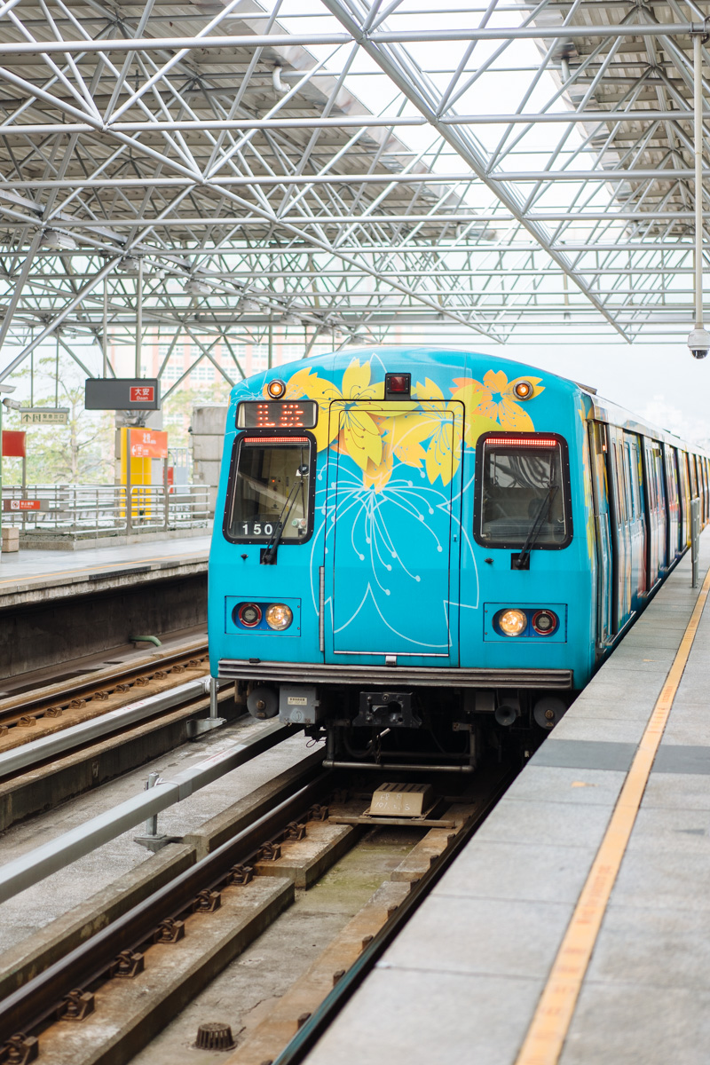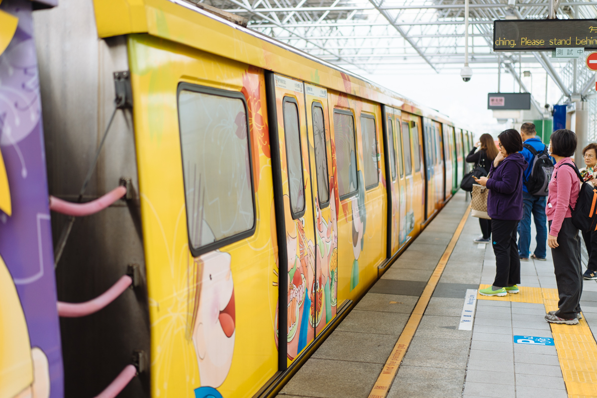 新北投的列车10分钟-15分钟一趟。不一会儿就来了。这个车每个车厢的配色和主题都不一样。顾客可以根据自己的喜好选择坐不同主题的车厢。