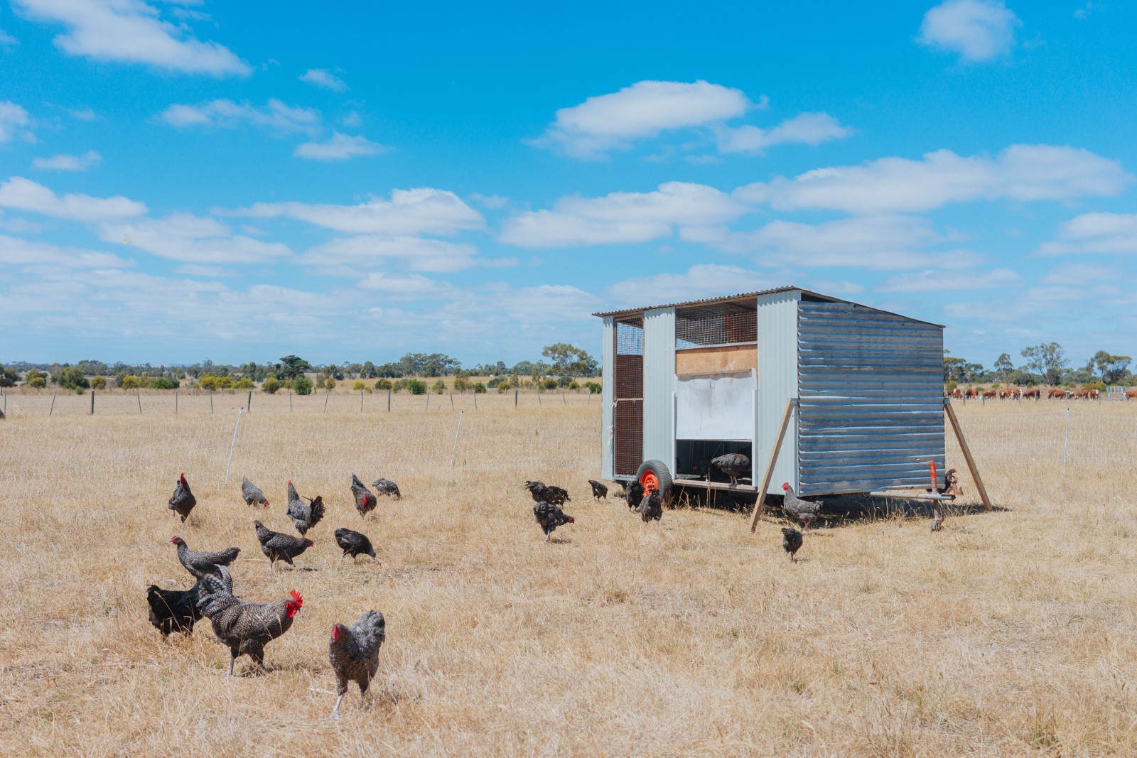 第三天一大早农场主就带我们参观他的农场。 首先是他们养的鸡是这种黑色羽毛的鸡。印象中鸡应该都是黄色的……好吧,他这种黑色的鸡据说鸡肉非常好吃,但是价格也超贵,$22/kg,一只鸡大概是5公斤左右所以一只鸡卖到了100块左右。对比一下平时超市买的,不可同日而语。