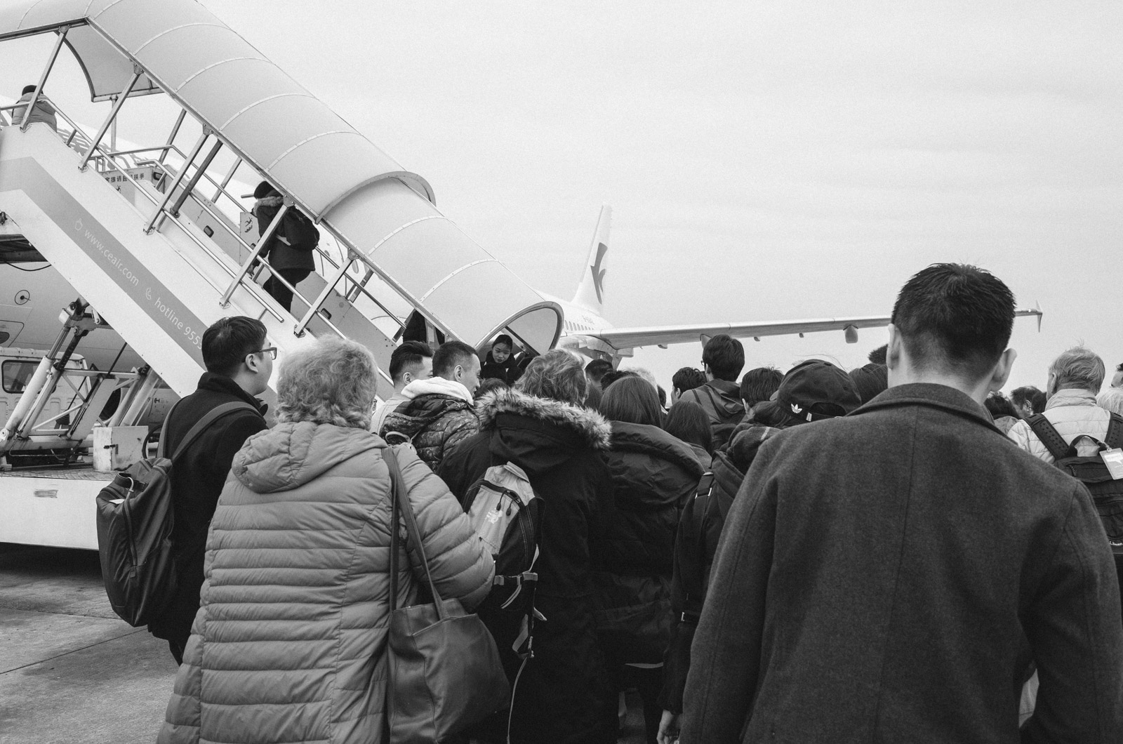我毫无意外地经历了“往前挤”的人流。我在心里想,那些一拥而上往前挤的人,他们是知道飞机只有在全部人都上去之后才会起飞的吧。你早上一分钟又能如何呢?