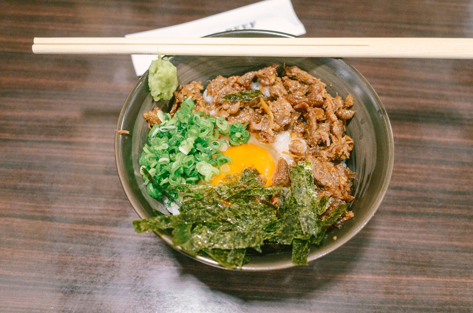 牛肉,芥末,葱,生鸡蛋和紫菜拌饭。我是第一次吃加了芥末的饭,非常的清爽好吃。