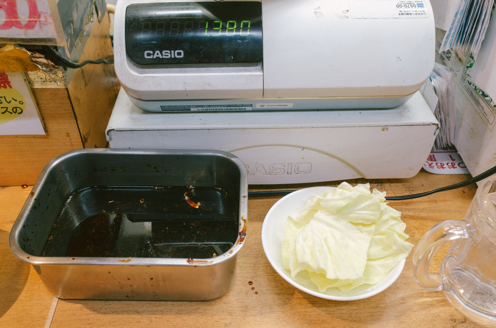 日本的吃炸串串都是蘸着酱汁吃的。那个白菜的东西我不知道怎么用……
