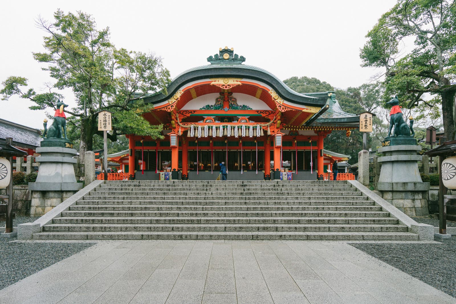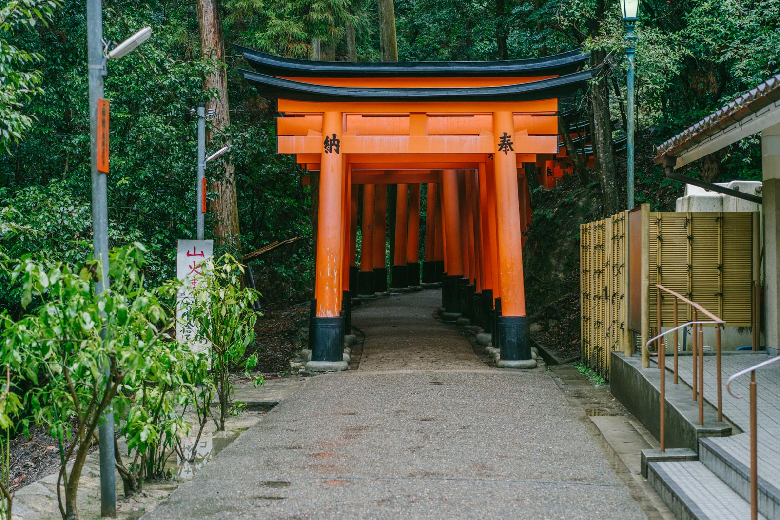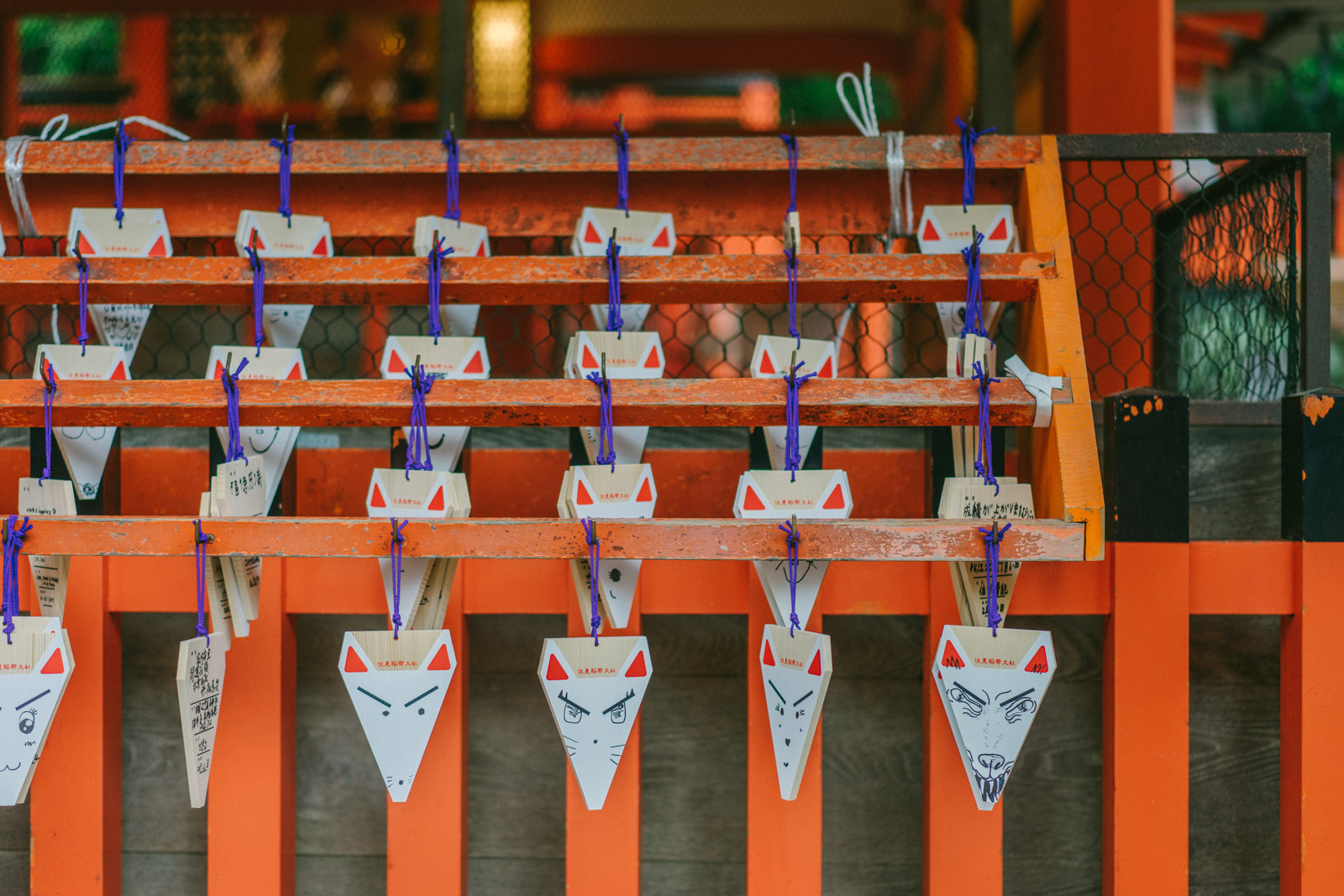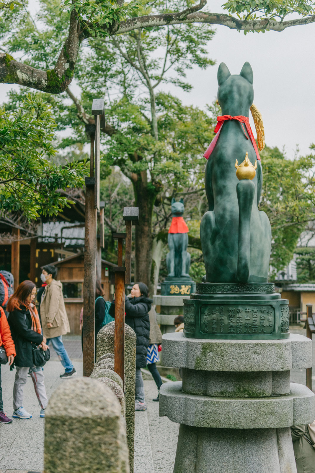 稻荷神指的是谷物食物之神的总称,民以食为天,也难怪稻荷神的香火如此旺盛。正殿门口伫立着两尊稻荷神神使狐狸像。对于我们来说来这里的目的当然是鸟居,我们快步往后走,路过了奥宮