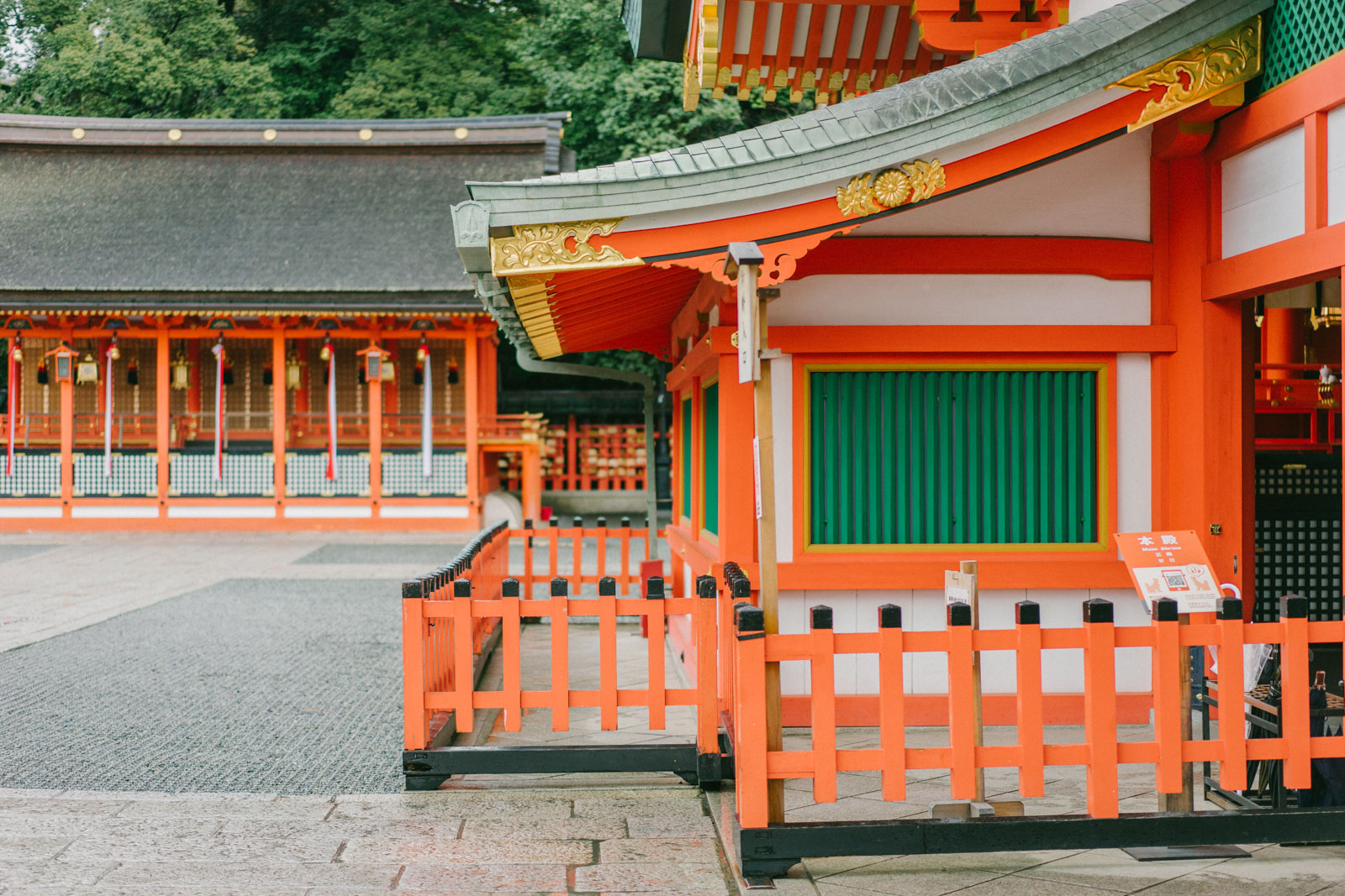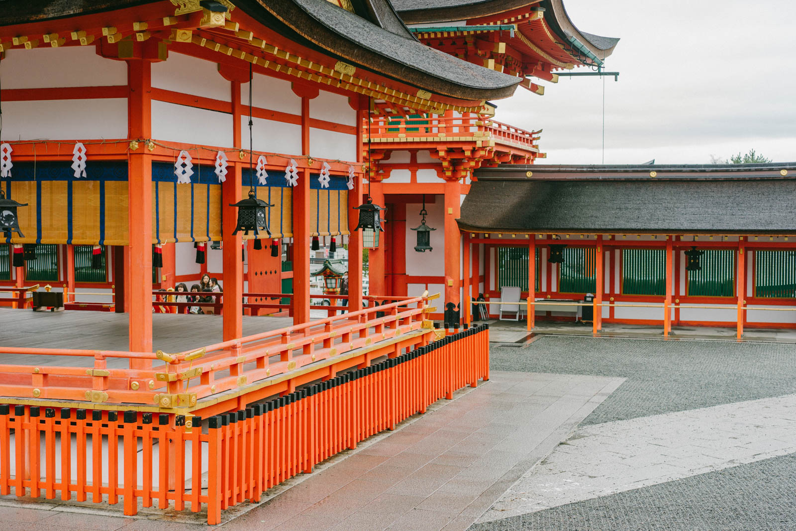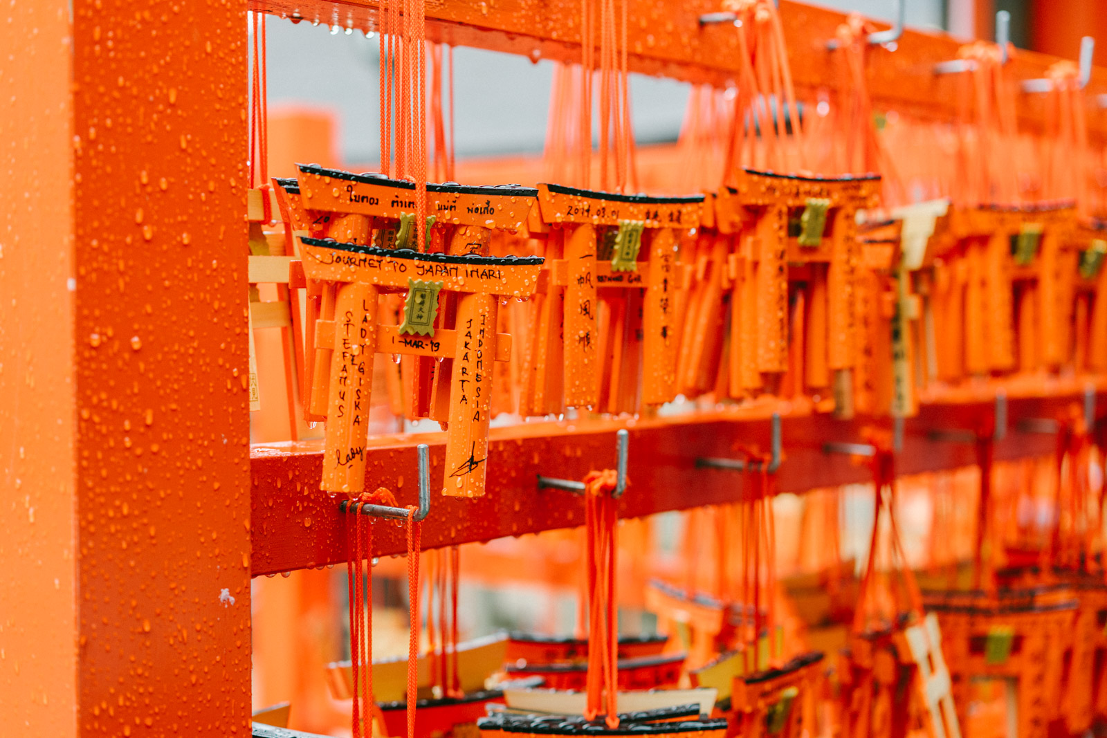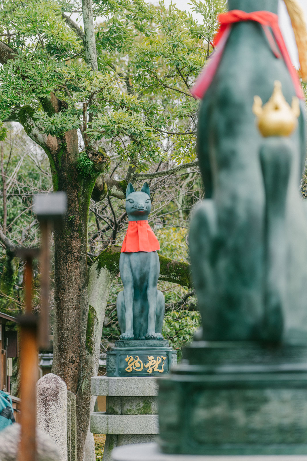 稻荷神指的是谷物食物之神的总称,民以食为天,也难怪稻荷神的香火如此旺盛。正殿门口伫立着两尊稻荷神神使狐狸像。对于我们来说来这里的目的当然是鸟居,我们快步往后走,路过了奥宮