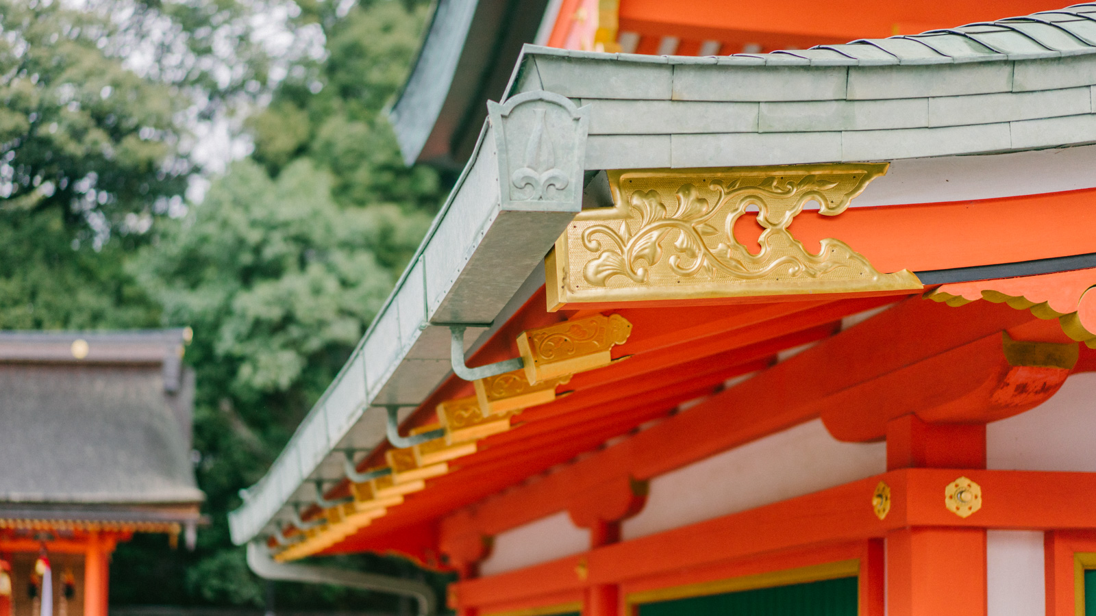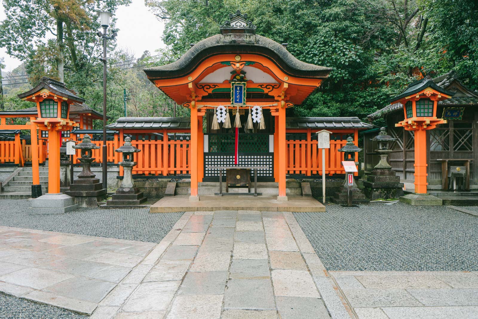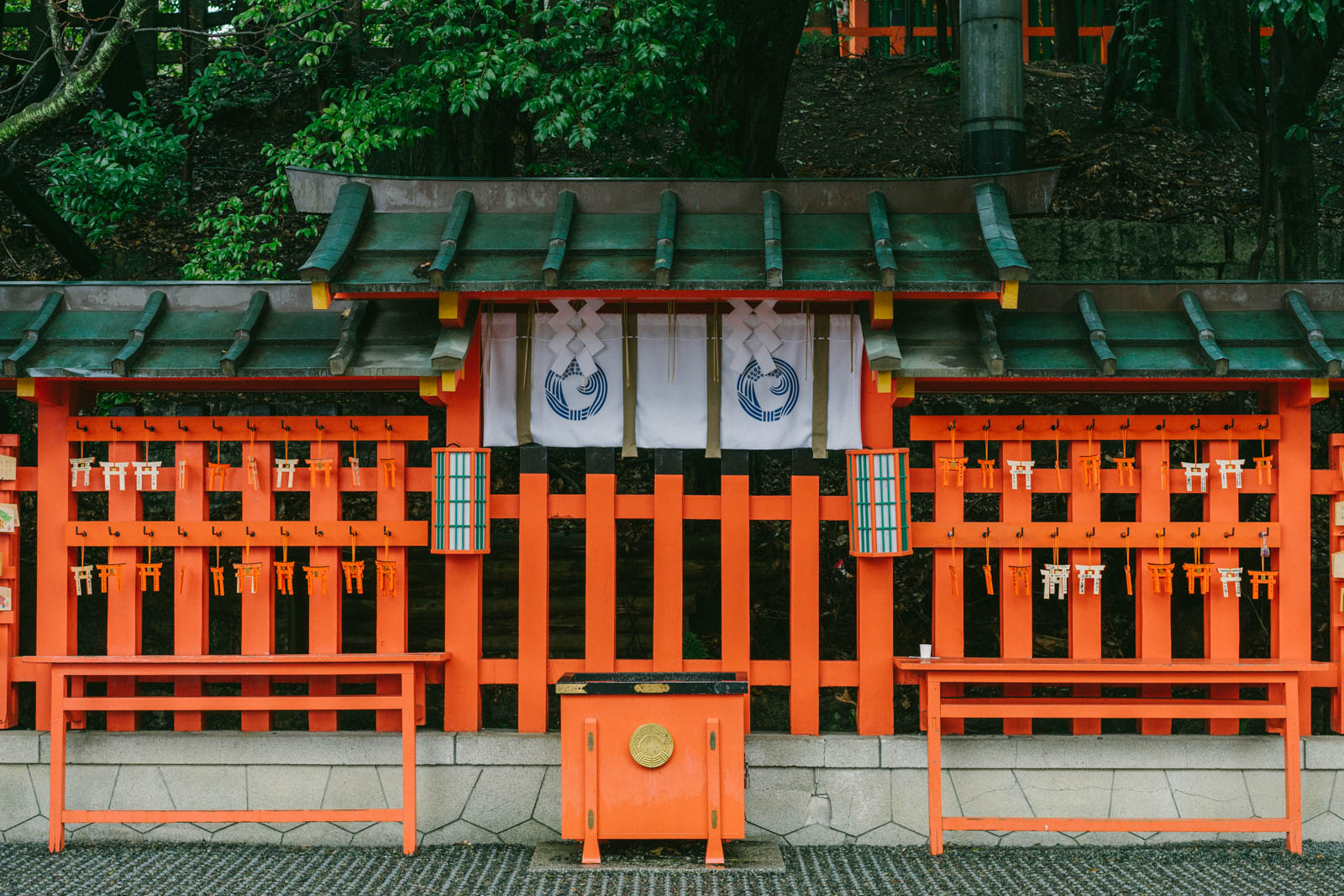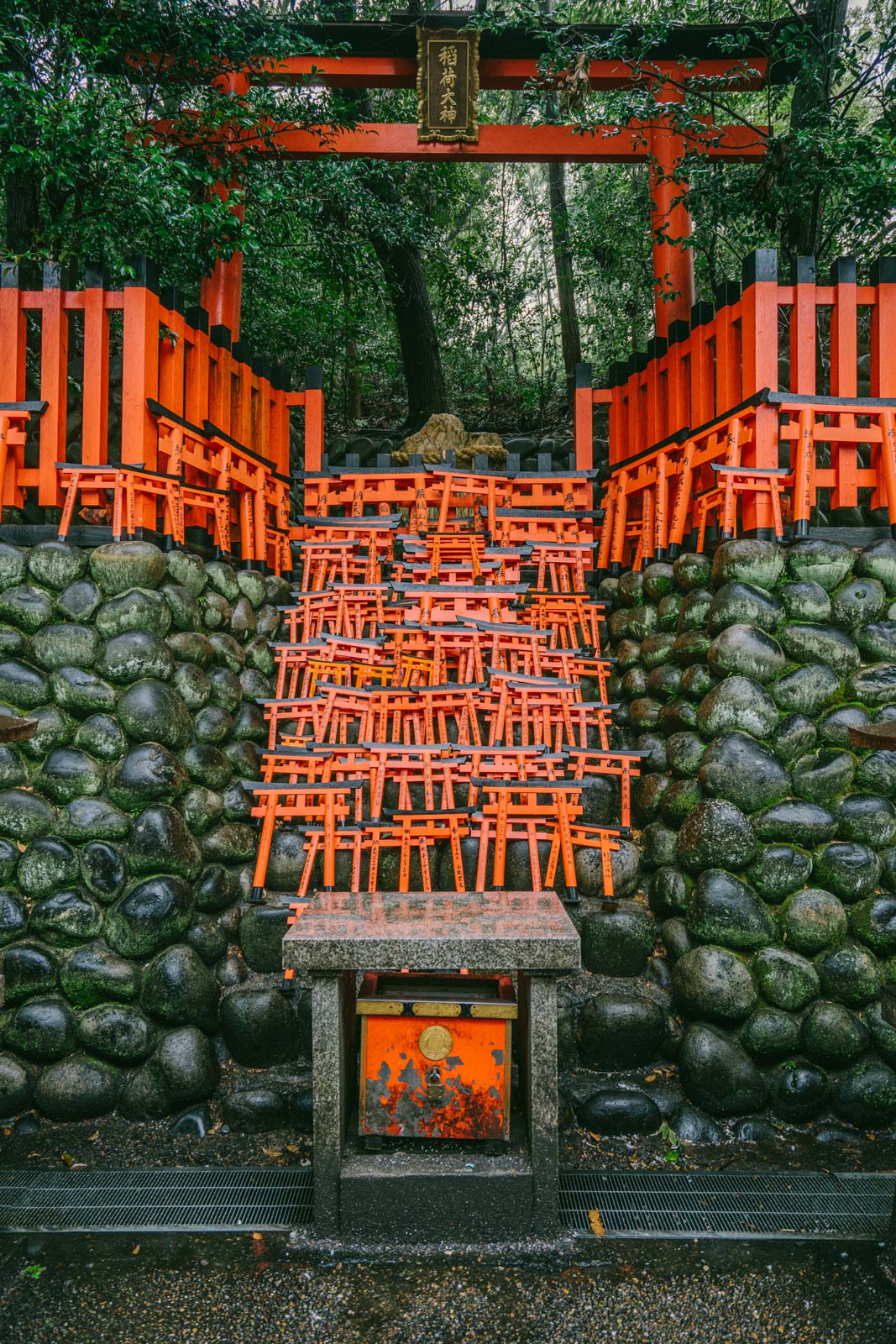 稻荷神指的是谷物食物之神的总称,民以食为天,也难怪稻荷神的香火如此旺盛。正殿门口伫立着两尊稻荷神神使狐狸像。对于我们来说来这里的目的当然是鸟居,我们快步往后走,路过了奥宮