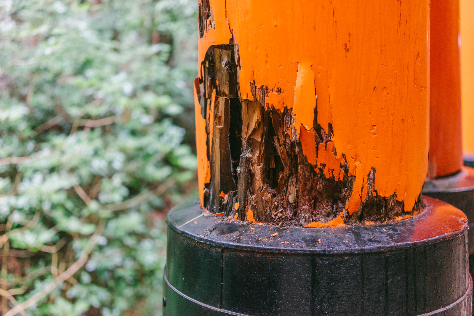 来之前通过照片和视频来了解这里总是把鸟居想象的很美好。实际这里有不少已经年久失修的鸟居,要么掉漆,要么如下图一般已经开始腐朽,更有甚者只留下了黑色底座,上面什么都没有了。