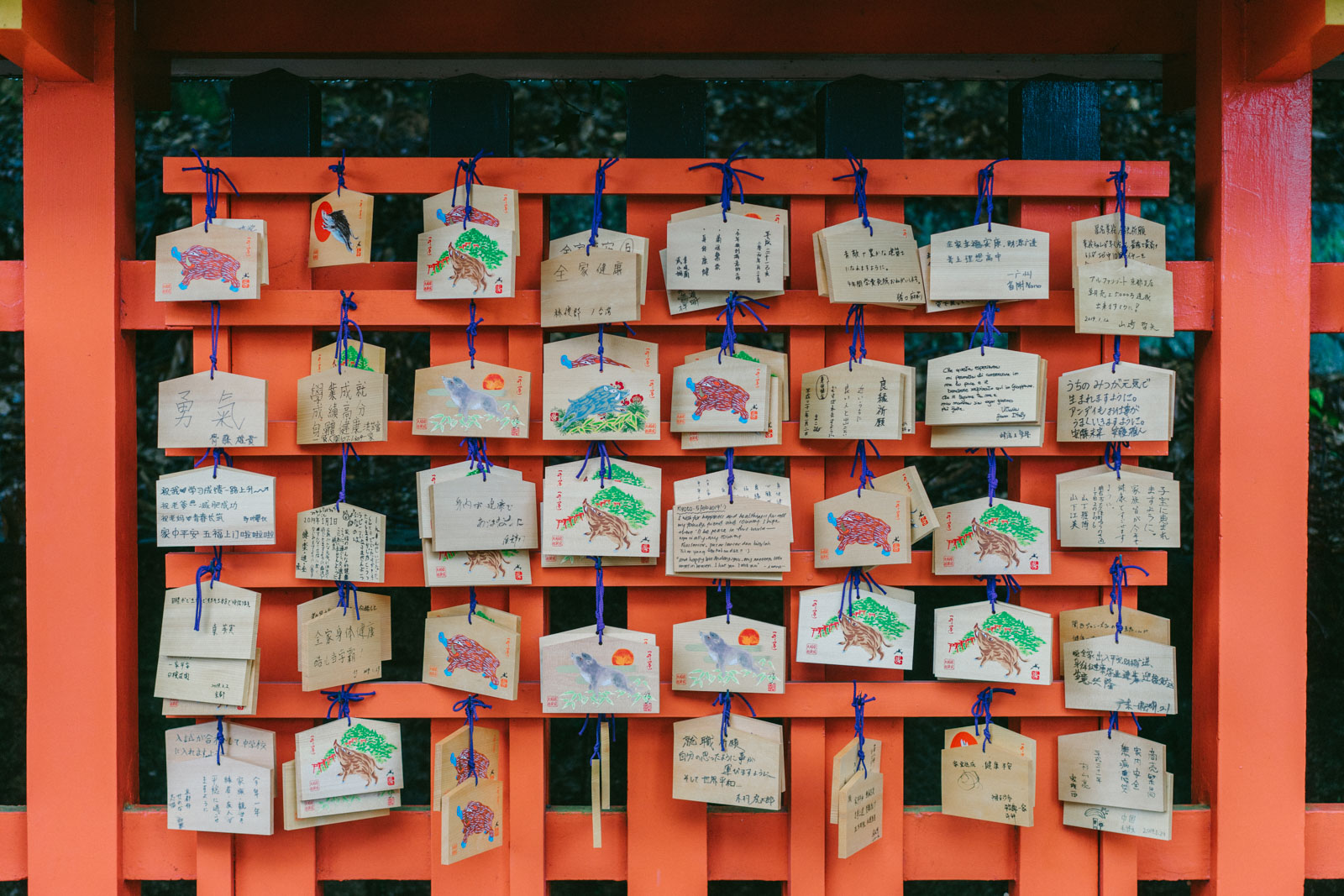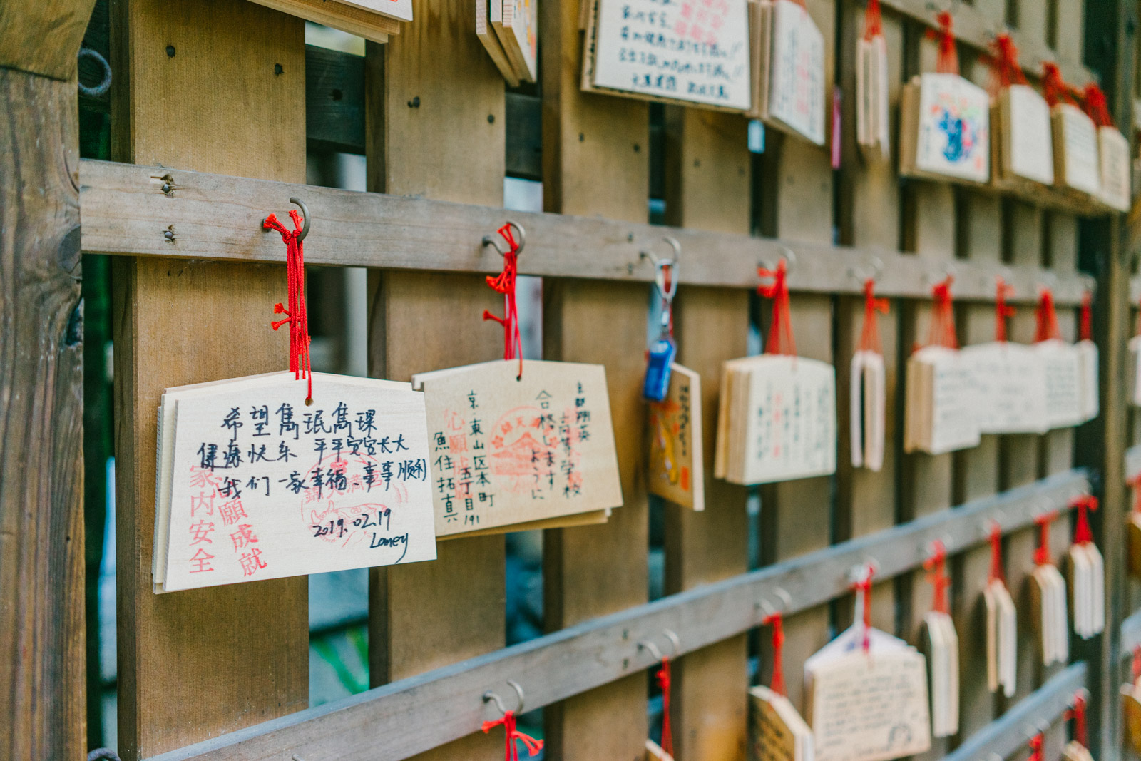 媳妇说我们也要写一个挂件祈福。这里的挂件当然都是鸟居形状,他们还会提供日文的翻译文本给游客,可以参考着写汉字在上面。