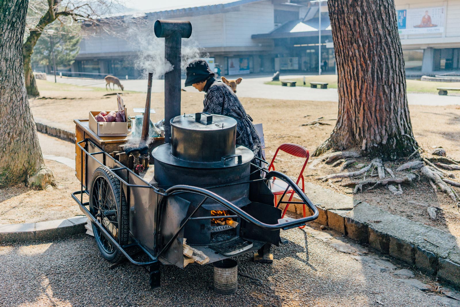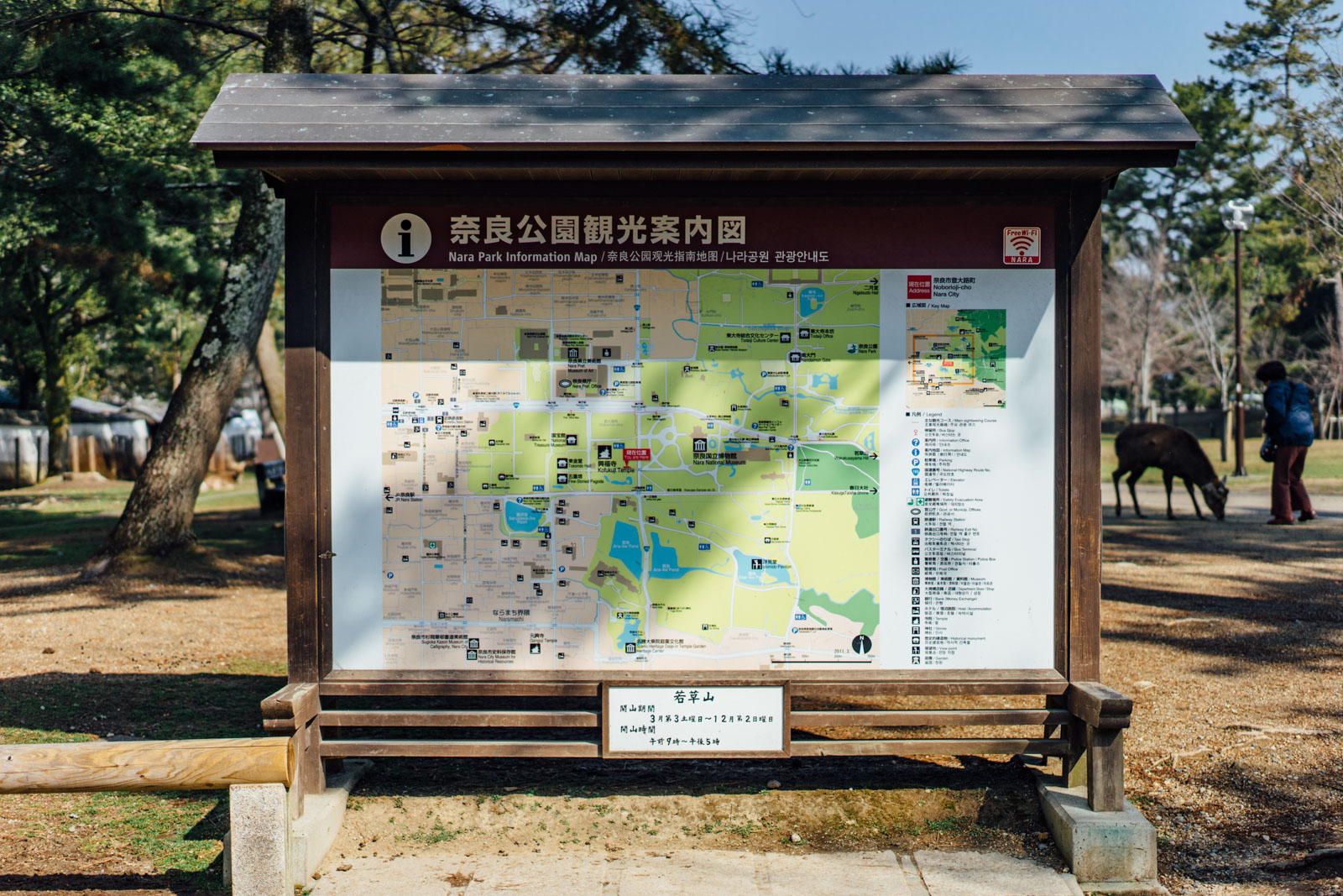 奈良公园的范围很大,我们其实早已进入了公园的范围。在公园地图这里我们第一次见到了奈良的鹿,这里也开始有人推着小车卖喂食小鹿的饼干。以前听说过太多奈良的鹿的传说,什么有礼貌,会鞠躬之类的。我们也曾一度认为这里的小鹿是上天的恩赐,既可爱又有礼,还跟人亲。