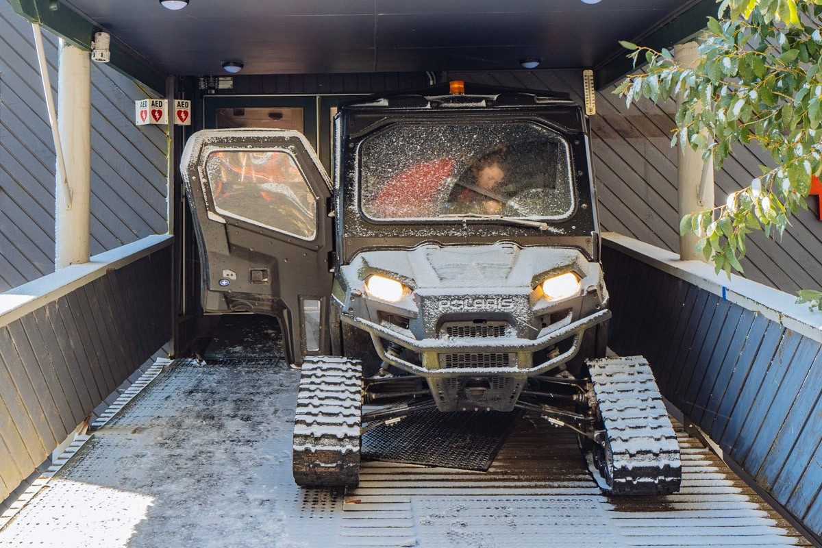 吃完饭我们就往滑雪场方向走过去。雪场里面也有很多旅店选择。但是这里的问题是你的车不允许停在滑雪场内。如果你选择了滑雪场内的旅店,你必须把车停到滑雪场外然后自己把行李搬进雪场。你也可以付钱让下面这种雪地Bus帮你搬运。