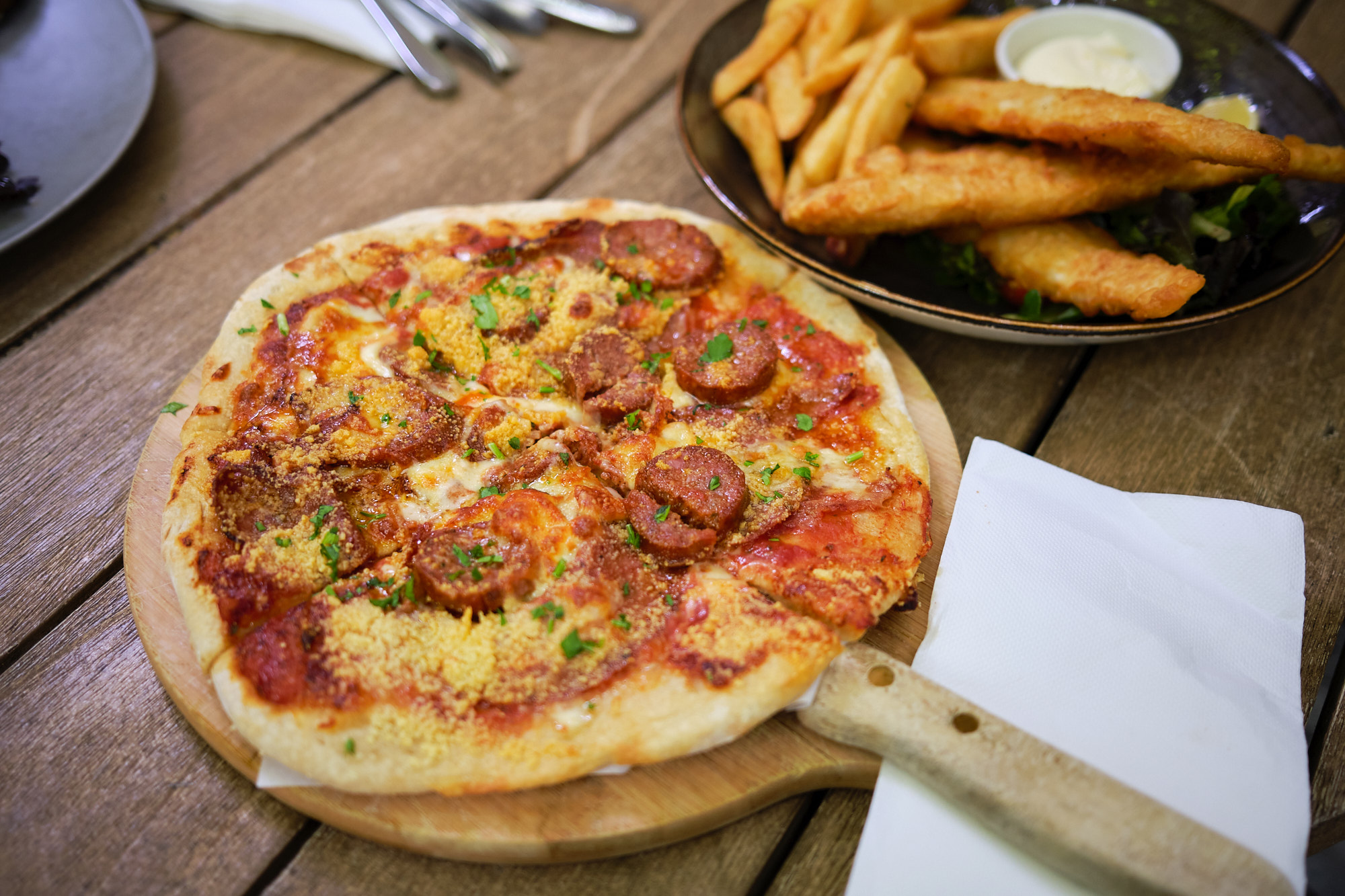 不一会儿吃的就来了。牛角包加Cheeze说实话很难做的难吃;炸鱼薯中规中矩;pizza的味道还可以,就是太油了。不过在公园里面吃午餐我也就不追求什么色香味俱全了