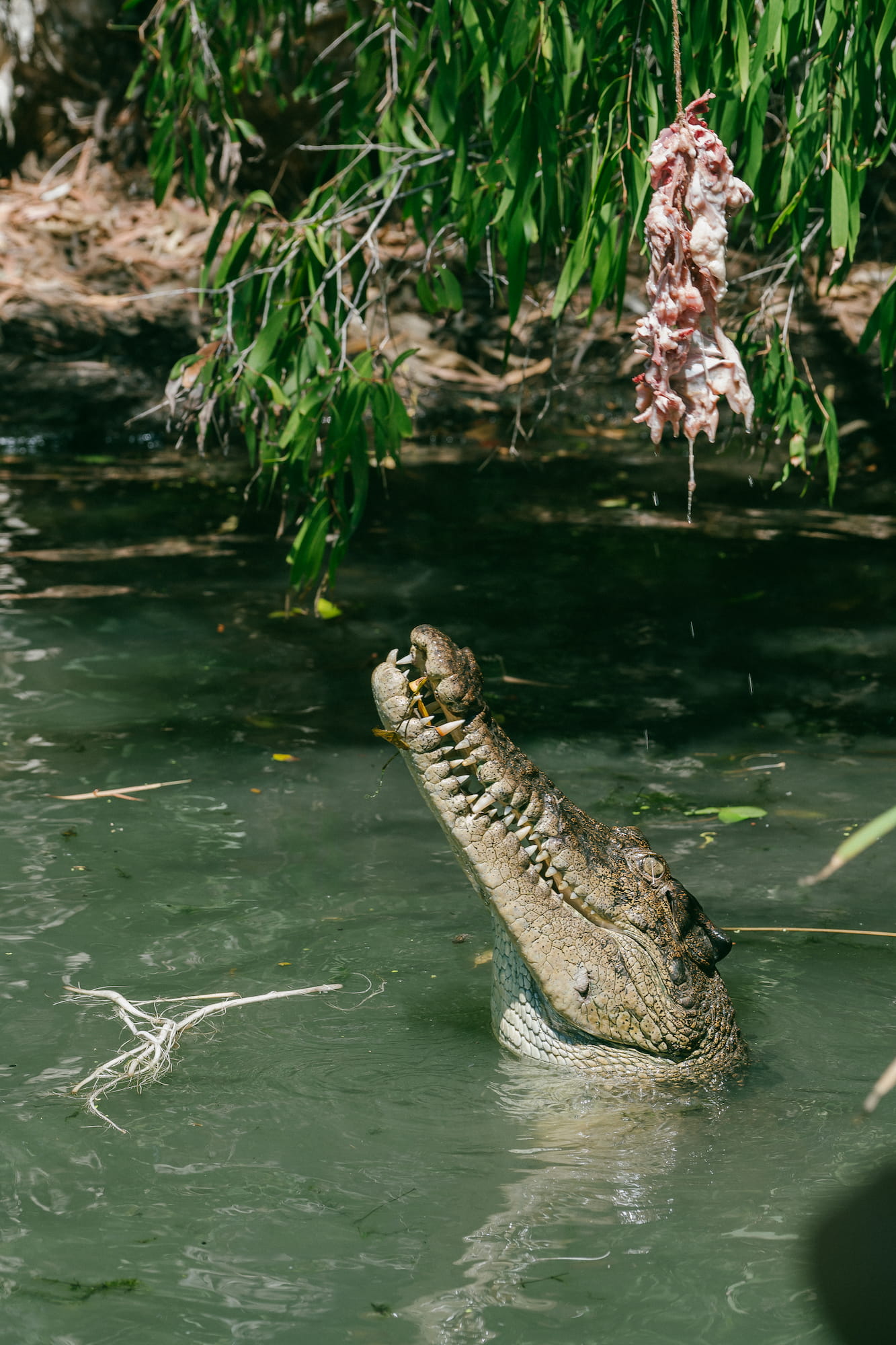 其中的一个环节大爷用鸡骨架逗鳄鱼玩。我给大爷捏把汗,鳄鱼的力量我很担心把大爷扯下水……