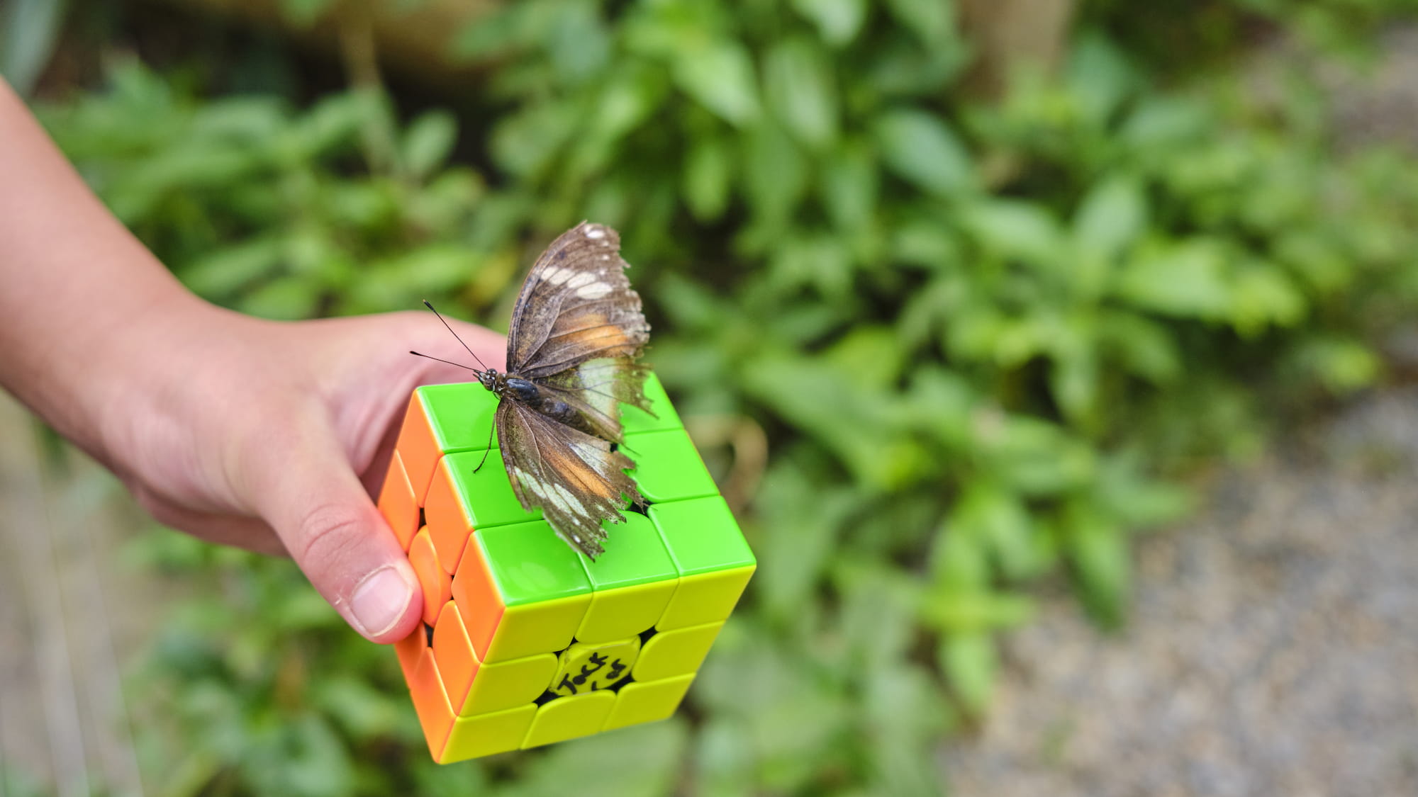 儿子观察了一阵子觉得蝴蝶也许是根据颜色来选择栖息的地方于是用魔方引诱蝴蝶,想不的还真的给他弄成功了,女儿看到哥哥成功了一直伸手出去想引诱蝴蝶过来,这哪能成功……😄