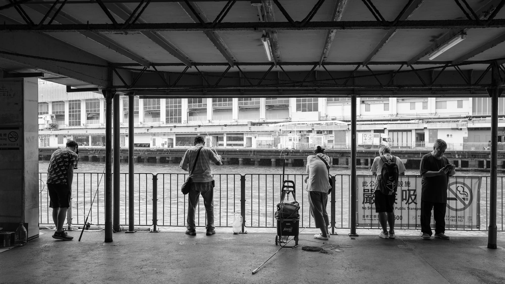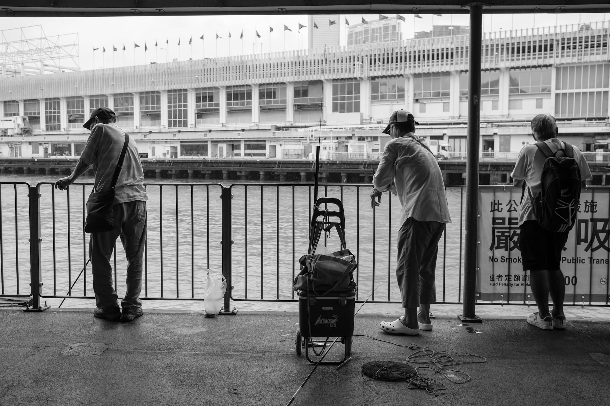 我们在海港城附近下车步行来到码头,想不到轮船这么密集的地方也有钓鱼佬出没。