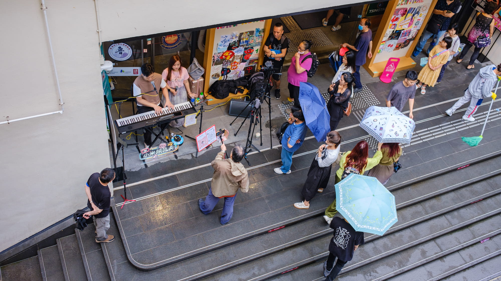 有人在街头表演,设备相当的专业,现在的街头艺术家可能都需要有自己的各种社交账号才能更好的打响知名度和生存下去吧。
