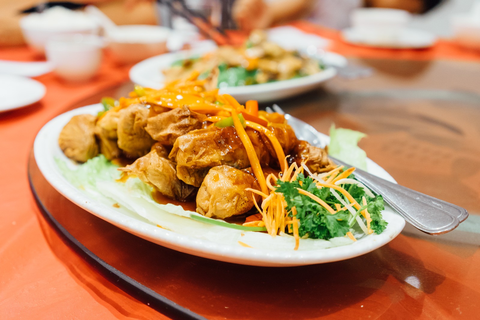 然后是干烧大虾。外皮用的是用豆腐皮,包裹好内容之后油炸;炸完了再用粉丝捆住“虾”身模拟出真虾一节一节的样子。我个人不是很喜欢酸甜口的菜式,不过我也吃了三只“虾”……😬