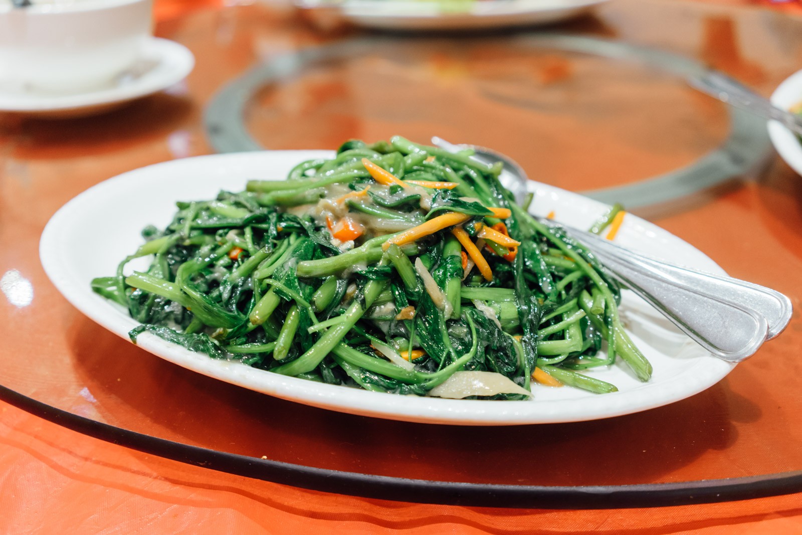 最后是这道椒丝腐乳炒通菜。珠玉在前,这道菜也只有含恨无人问津了。