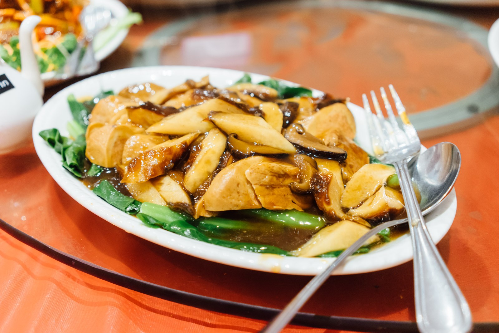下面这道菜叫三菇炒牛肉。鲜美的各式蘑菇搭配这个不知道用什么做成的牛肉真的是啧啧啧……😍一般来说如果肉处理的不好总会有一股动物本身的骚味,这里的“肉”因为是用植物做出来的,因为完全规避了这个问题而且在味道和口感上也弥补了用牙齿甚至舌头切断牛肉纤维的快感。