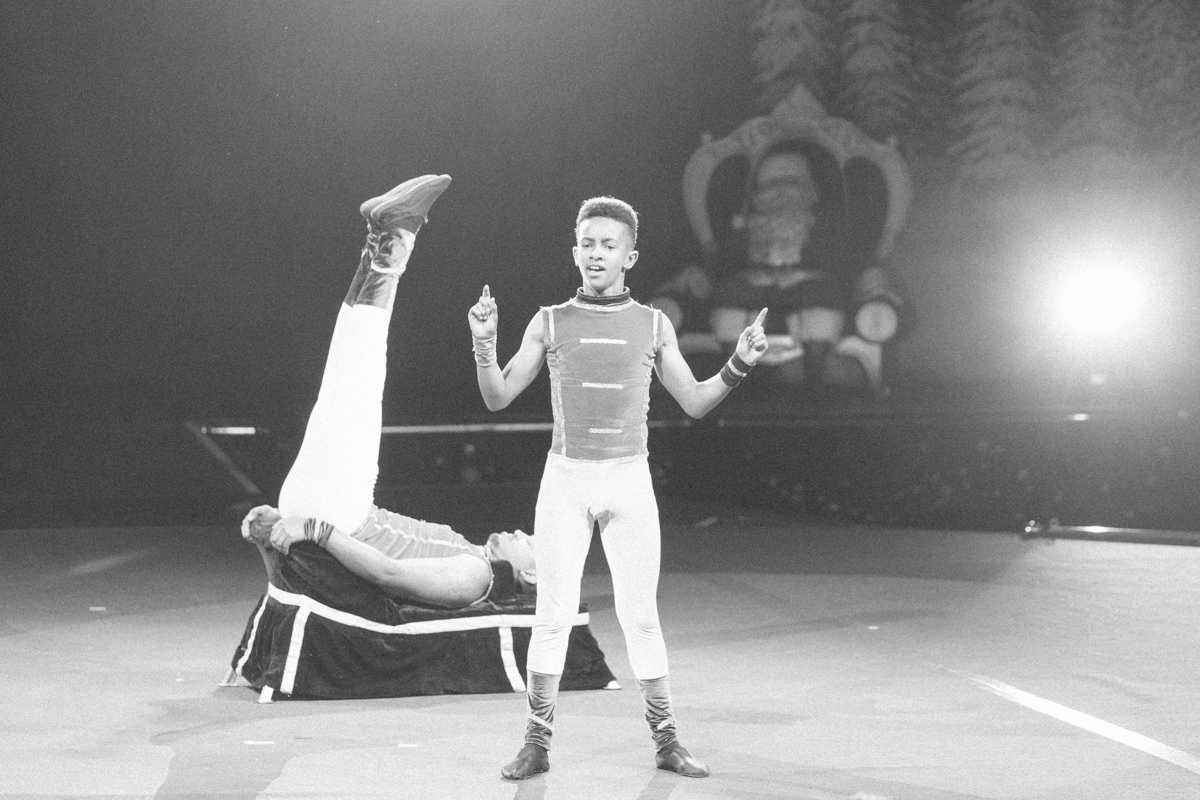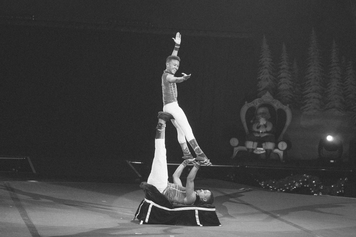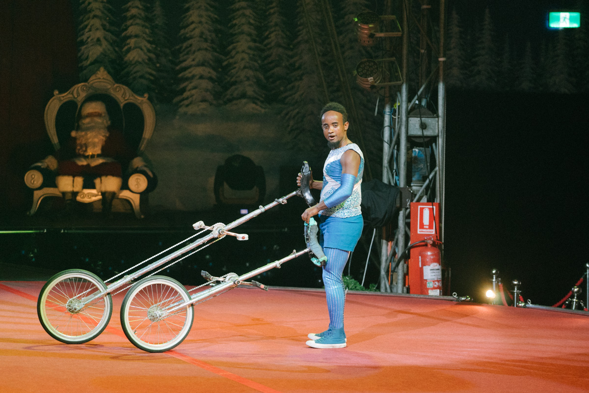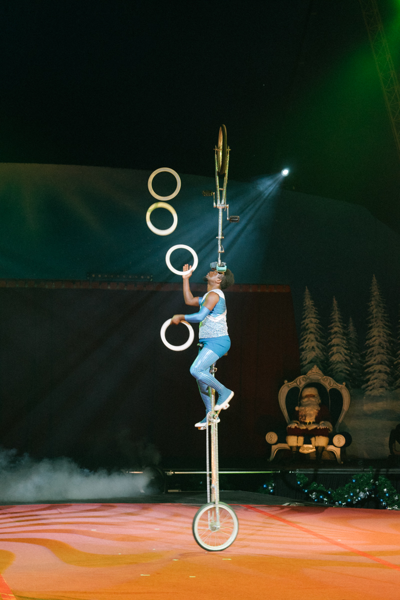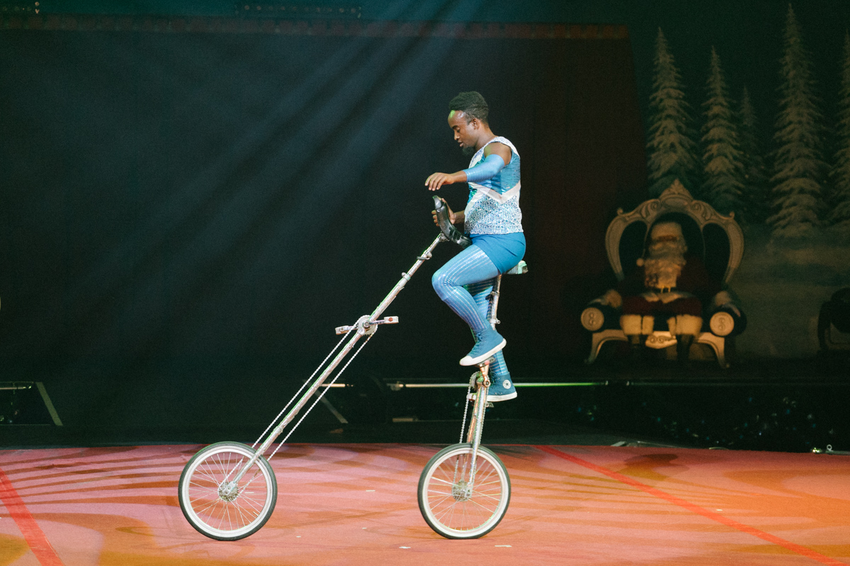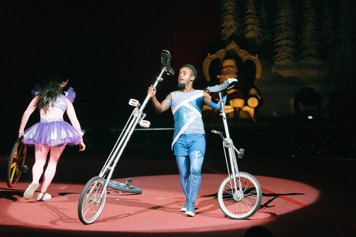 接下来的两个“士兵”表演的是打筋斗。下面的大一点的演员用脚和手调整上面做翻转的小演员的位置。整个表演一气呵成,也是精彩非凡。接下来登场的是这个圣诞老人的左护卫,他是玩轮子的专家。开场先玩一下单轮,然后就是“高跷”单轮车。最后他竟然可以在骑着一辆单轮车,头顶一辆单轮车的同时Juggling Rings。