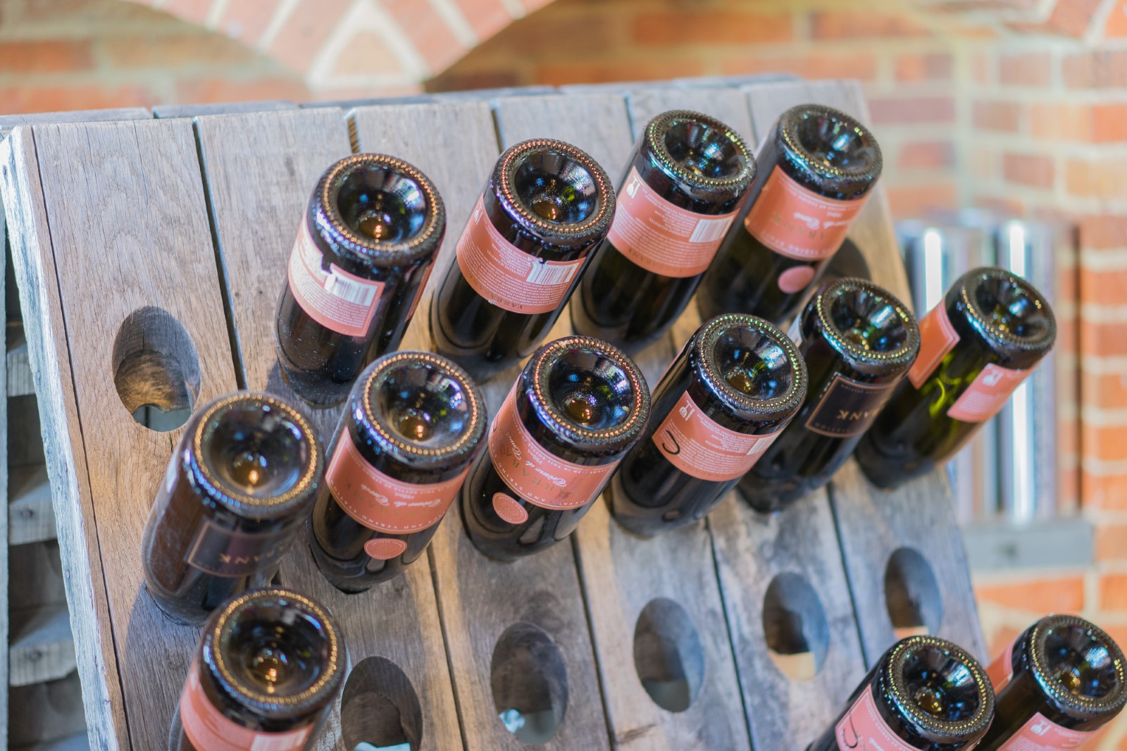 前方的酒桶上正骑着摆放着小瓶的白葡萄酒。