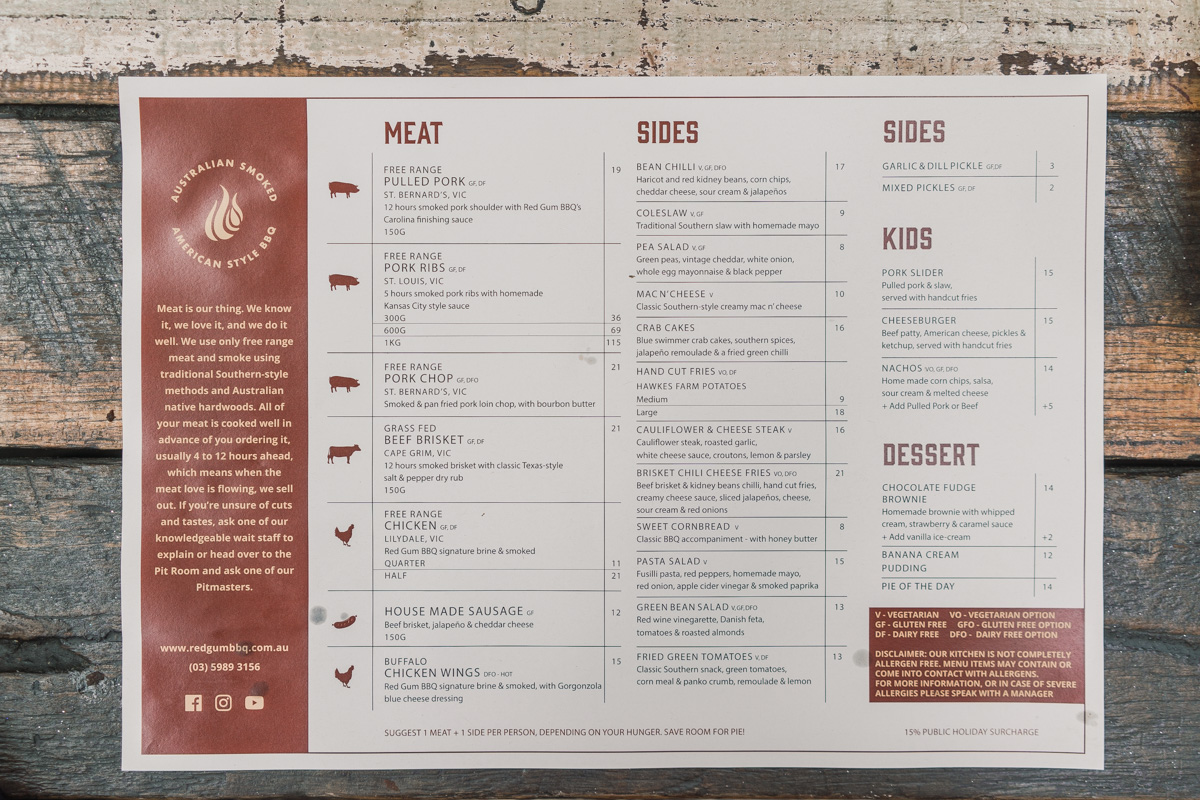 出来一看时间已经接近6点,如果开车回家可能吃饭就晚了。媳妇之前已经做好了功课,她指示我开车去一家叫Red Gum的美式烧烤店。来澳洲这么多年我们还从来都没在专门的烧烤店吃过,因此我对这家餐馆还是有点期待。