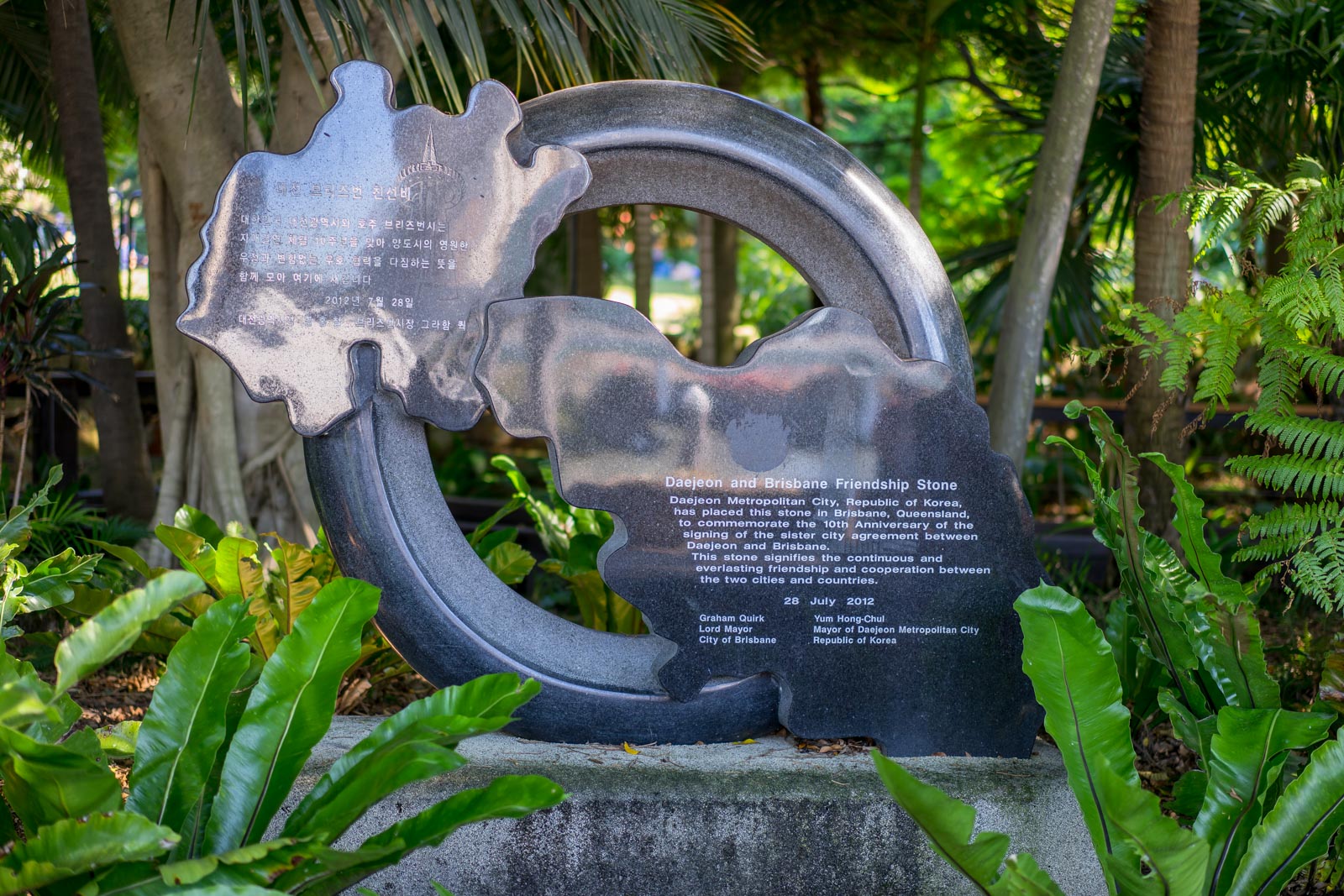 可以看出Brisbane市政厅做了很不错的功夫,他们在河边的步道做了一片Rainforest Walk的区域,我在这里看到了日澳友好纪念碑(可惜有个外国大妈坐在前面,没办法拍)还有大田广域市和Brisbane市的友谊纪念碑。我还说找找看有没有跟中国某城市结缘的石碑呢,可惜没找到。