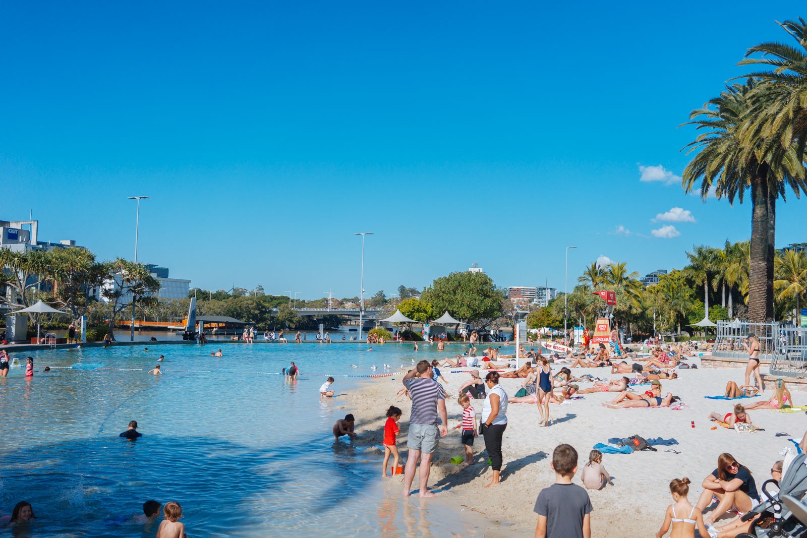 再走一点我就被这突如其来的沙滩给吓到了。实在没想到布市竟然在市中心河边修建了这么一个人造海滩,这真的是完美配合了昆士兰的阳光和好天气。孩子们看到沙滩都兴奋的不行,我们就在这里玩了一段时间。