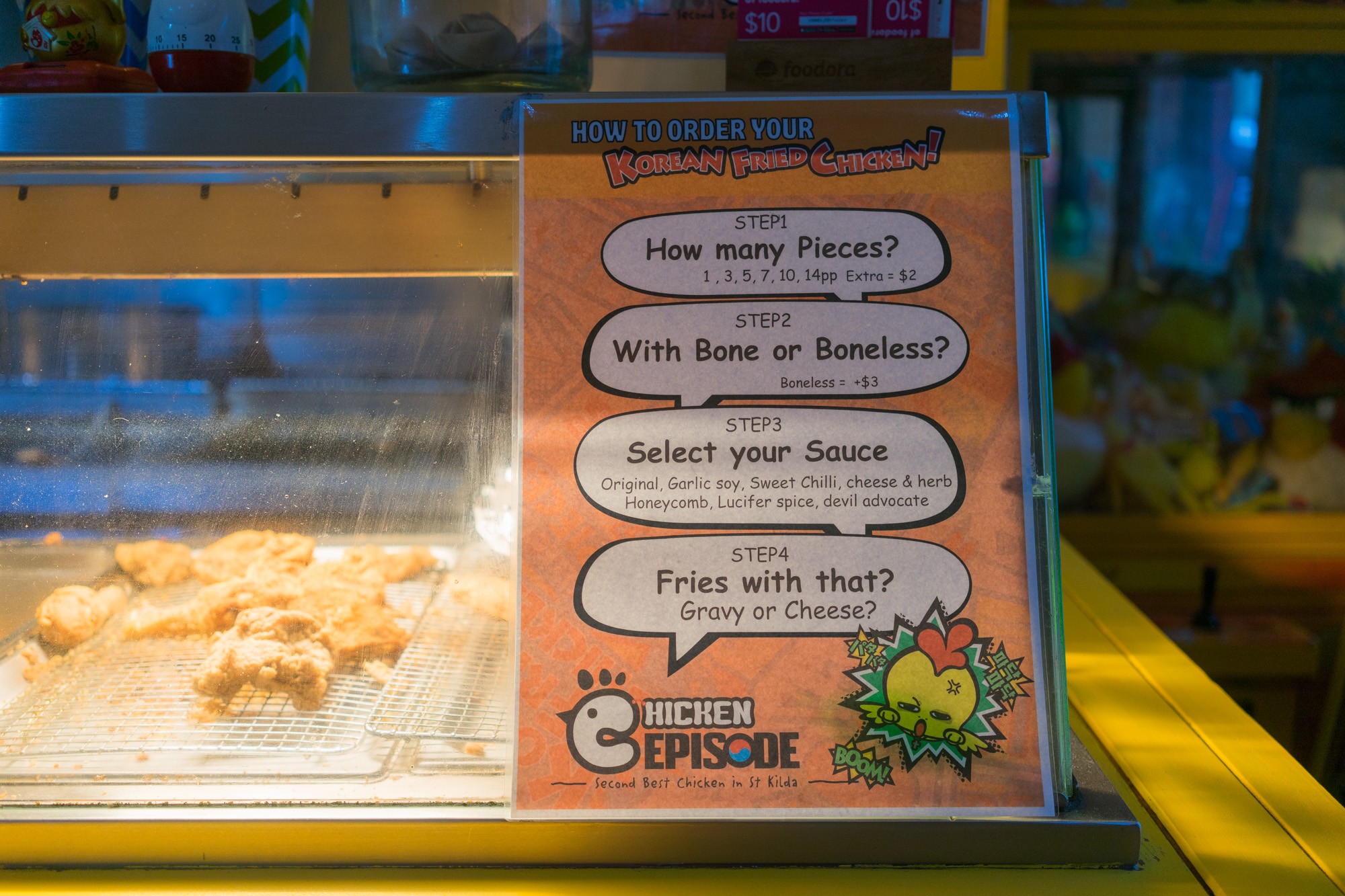 上周末带孩子们去Luna Park庆生,玩的差不多了带孩子们去吃东西吧。Park对面就是一家M记,澳洲的麦当劳我一般也就吃个雪糕,买个Frozen Coke,吃的还是免了。在Google Maps上仔细搜寻一番,发现有一家吃韩式炸鸡的地方,那就是这里了。