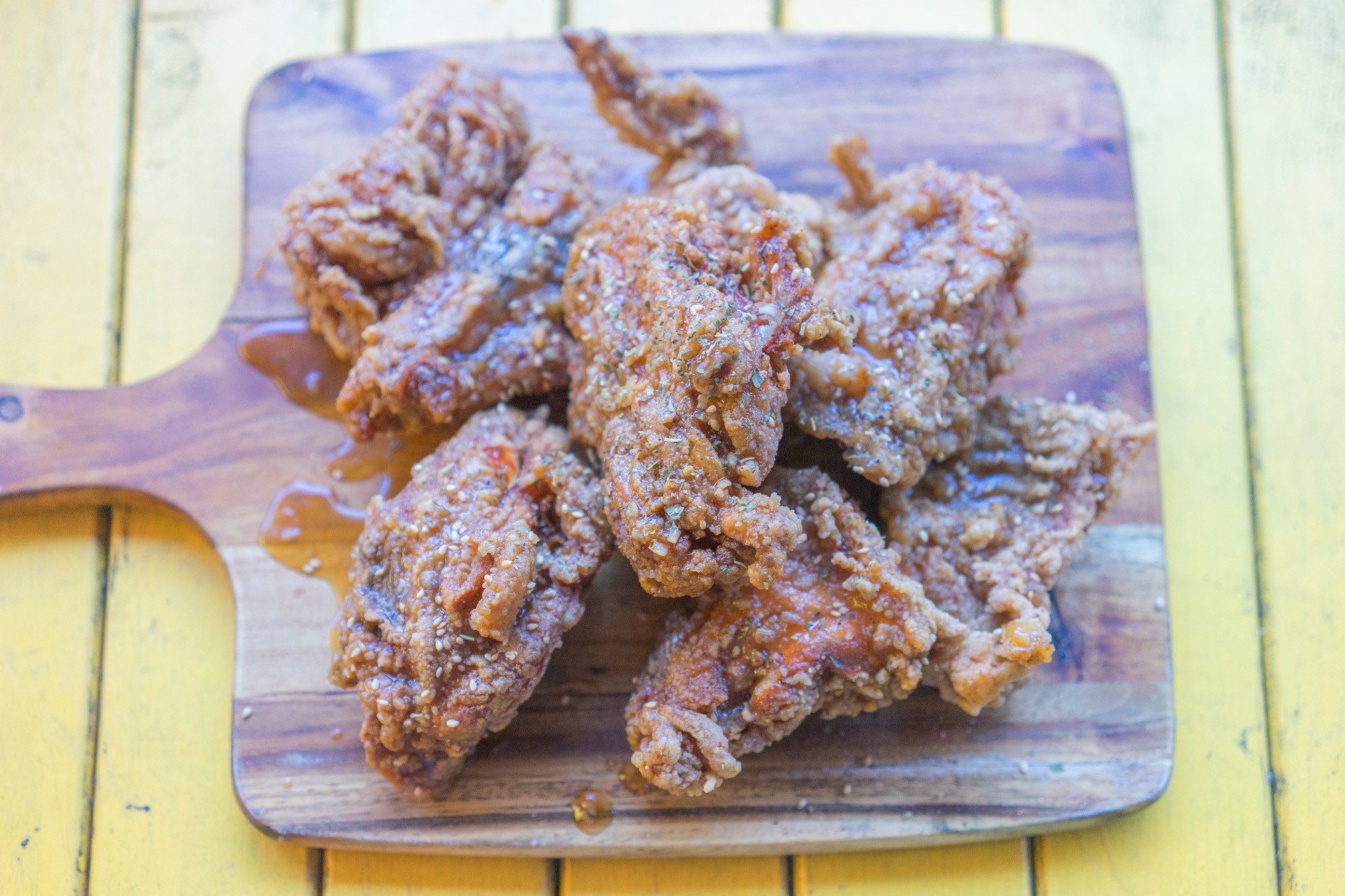 没过多久就上菜了。我点了两种口味的炸鸡,Original和Garlic Soy,一份Lucifer Wings。一口下去,这个炸鸡是好吃的,炸的酥脆的外壳搭配鲜嫩的鸡肉,相当不错。特别是Garlic Soy它们很创意的加上了Oregano,平添了一丝香气,不错。
