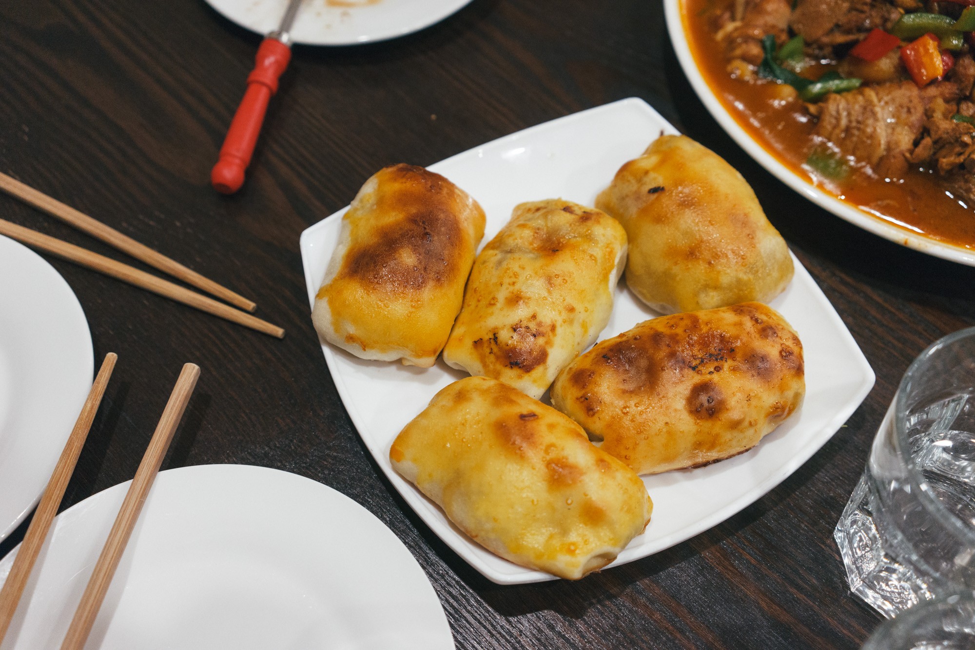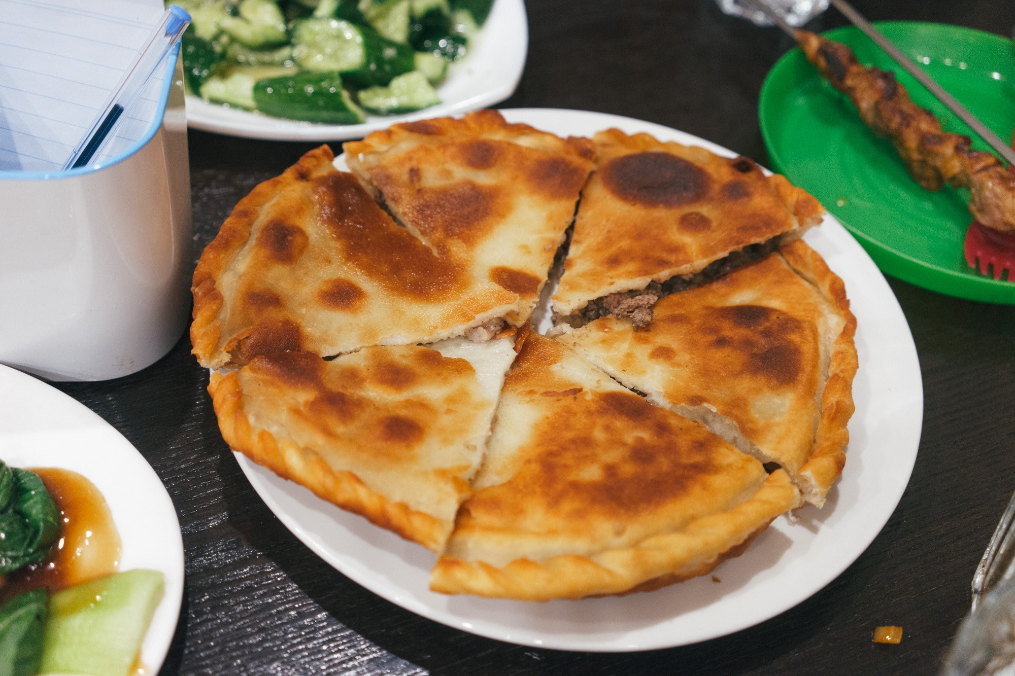 后面这两个是主食,一个烤包子,一个烤肉馕。烤包子里面是羊肉,也许是前面吃的烤羊肉味道太深刻,虽然肉还算是嫩,但是跟烤肉对比起来风味全无,也就胜在口感还行。包子皮也跟我想象中相对的不同,看起来焦黄,实际上是软的。烤肉馕上来的时候我已经吃饱了所以我没有尝试,但是很明确的一点就是味道肯定是不及烤羊排和羊肉串。