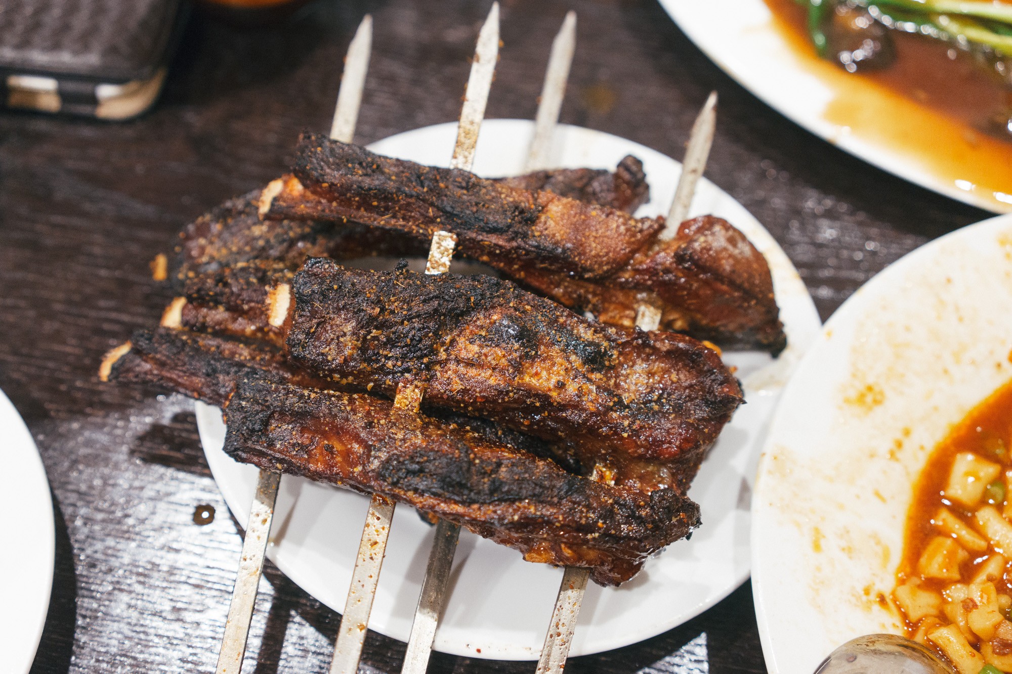 再下来就是烤羊排。我们因为已经点了肉串的原因,没有点他们的烤架子肉(感觉这个会是一个大菜)就点了两份烤羊排。 不得不说这个烤羊排真是好吃。外面好像已经烤糊了,实际上正是这种烤到了焦与不焦边缘的肉才最好吃。这个烤羊排选用的是软肋的部分,有一部分骨头是软骨,牙口好的可以吃一口骨头上连着筋膜的嫩肉,一口嚼着香脆的软骨,怎一个爽字了得。