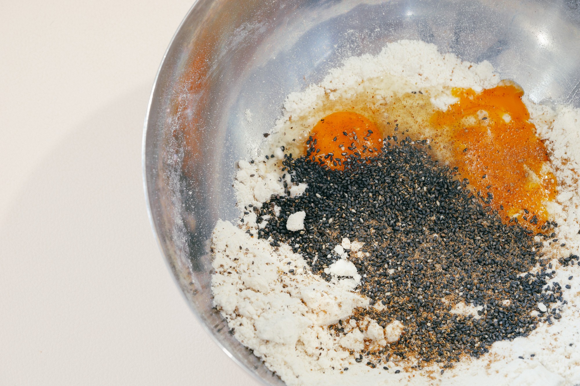 - 放入鸡蛋,盐,芝麻,五香粉和花椒粉(都是少量)