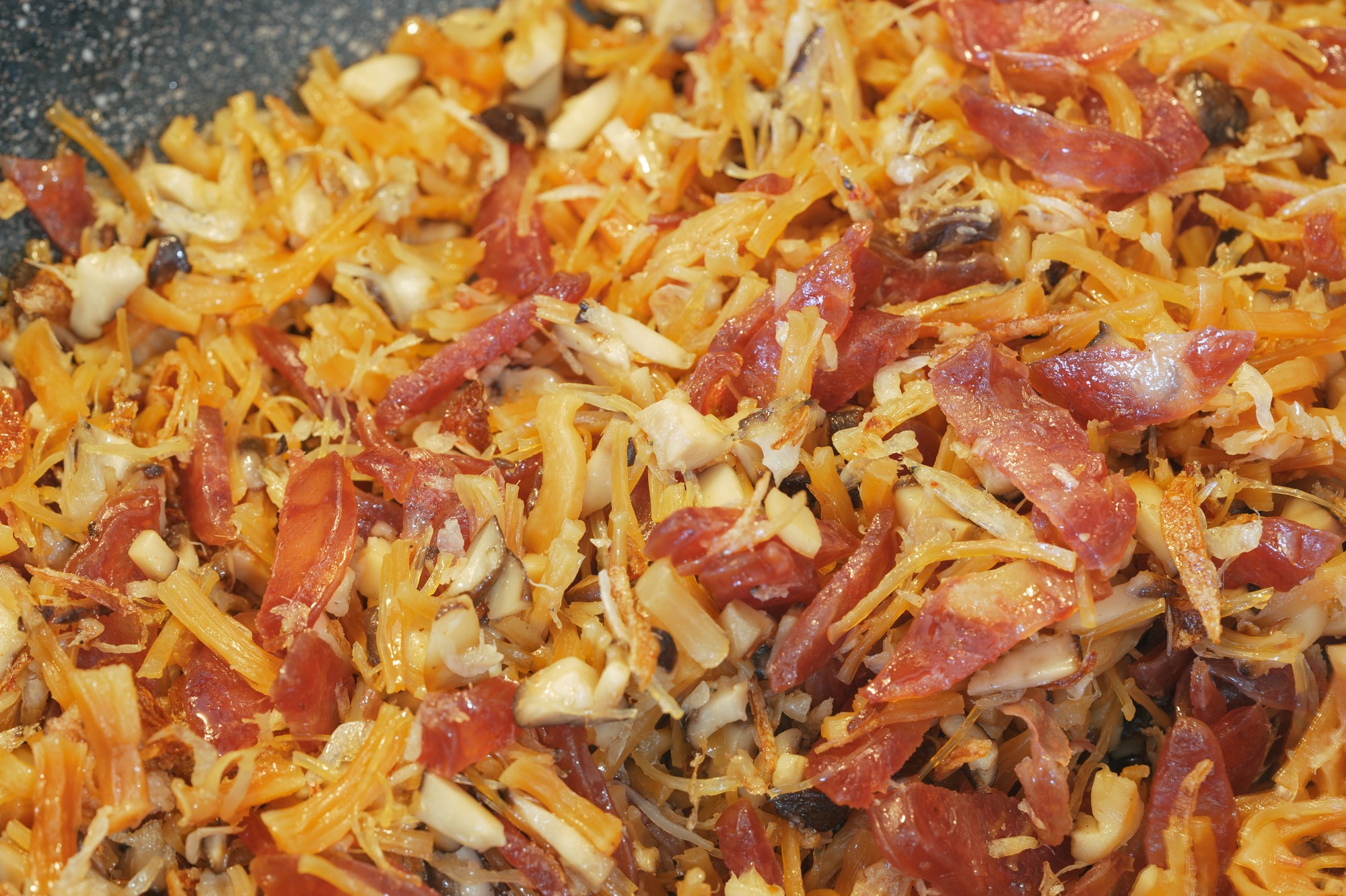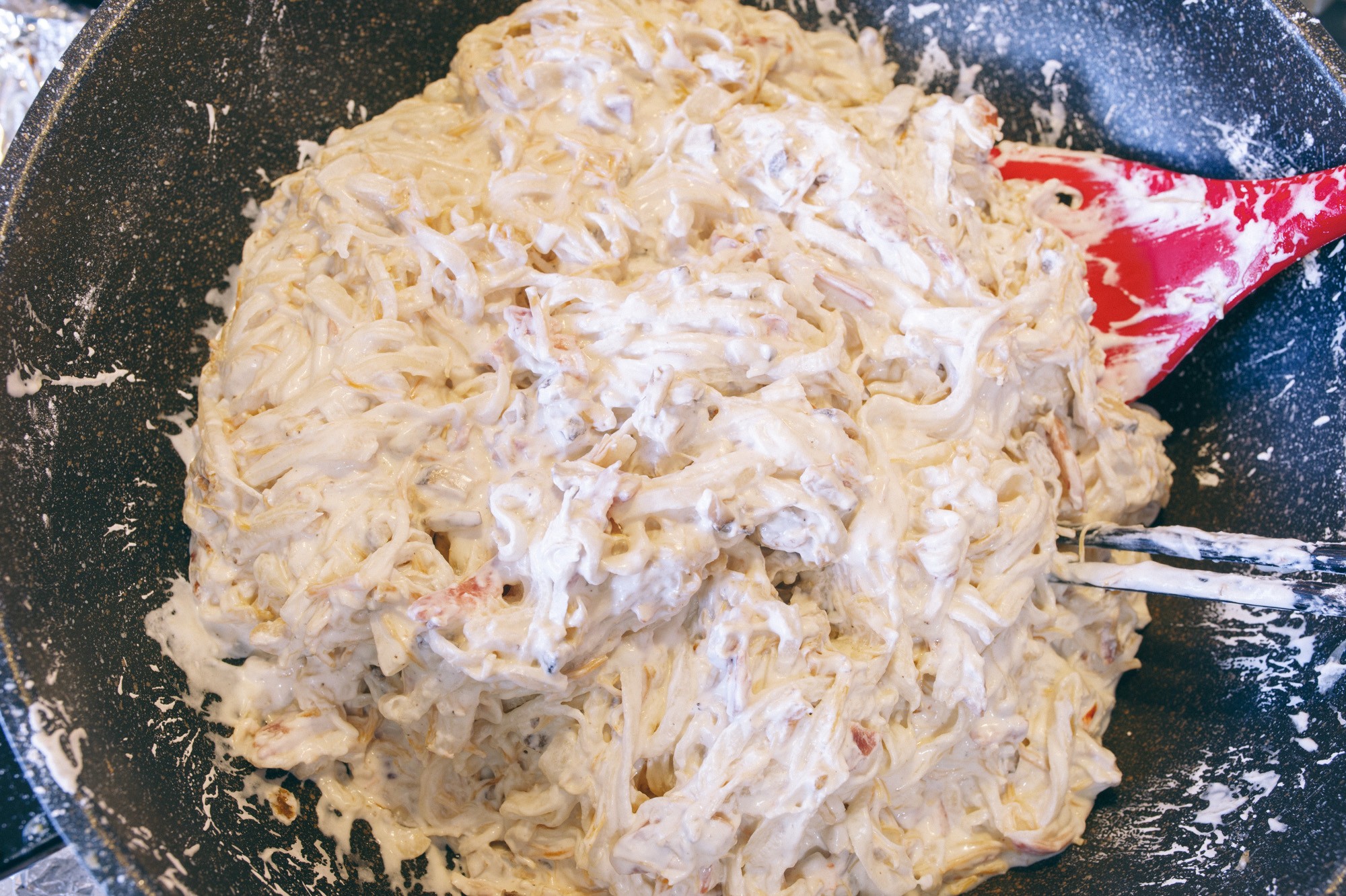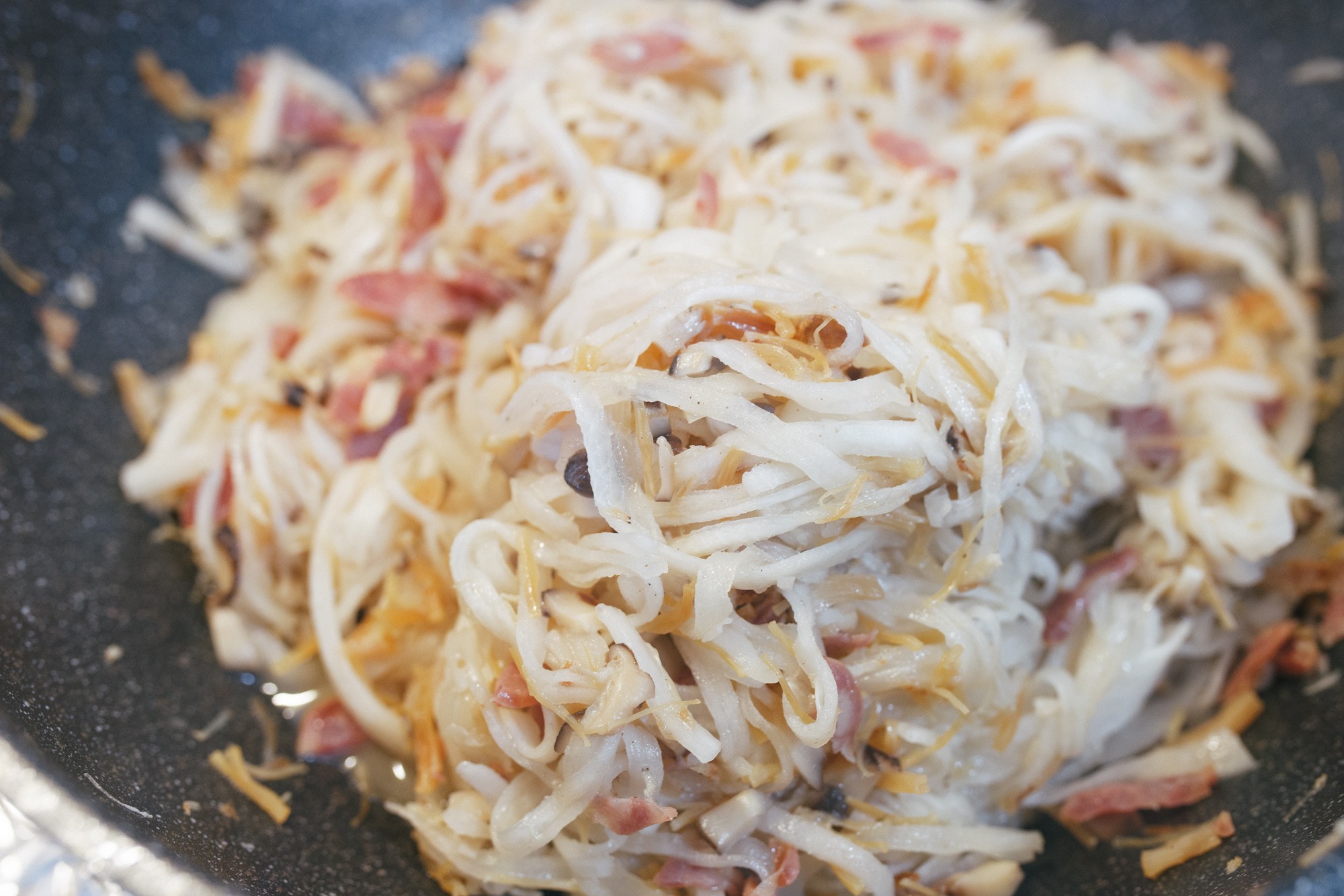 - 萝卜会慢慢地出水变软。等到萝卜丝全部都软化不太会出水的时候加入粘米粉慢慢炒匀。这里需要注意的是,萝卜有个体差异,有一些出水出的特别多,有一些出水出的比较少。这个时候就可以把之前用来泡香菇和瑶柱的水加一点进来做调整。混合完成如下图: