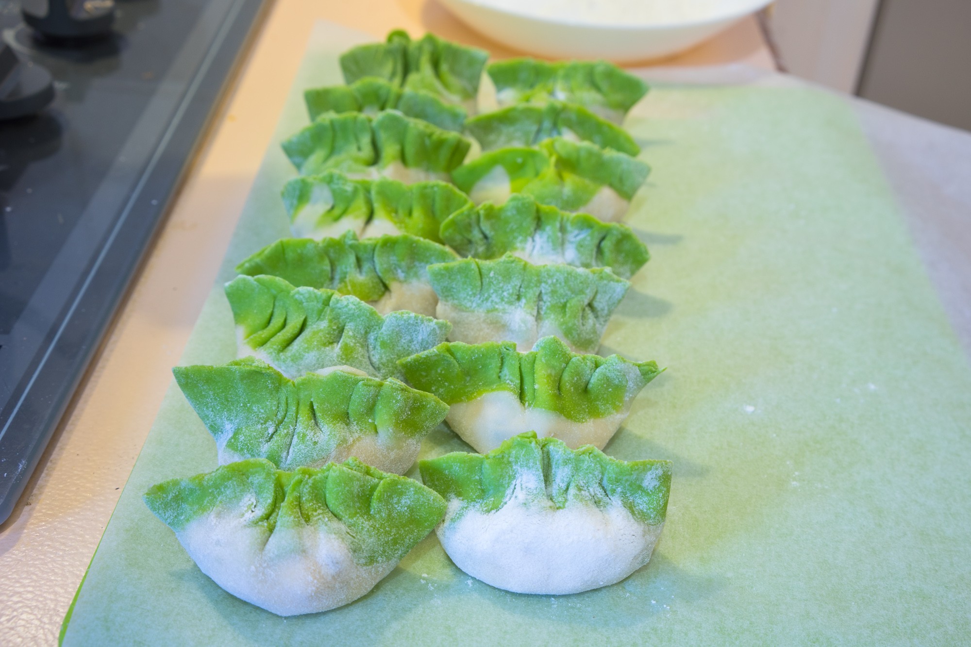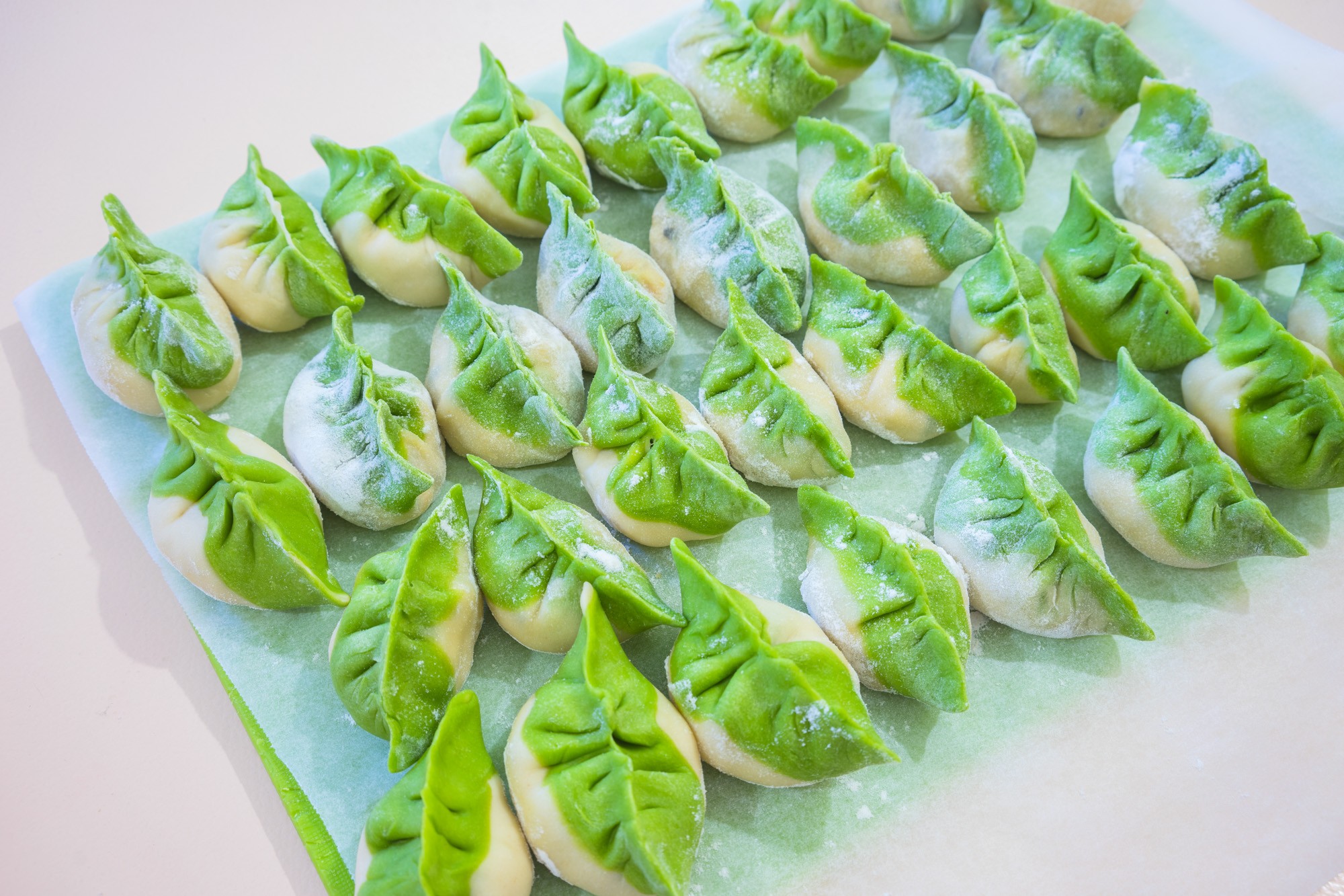 我先是帮她和了一个白面团和一个绿色的面团(用Baby Spinach的汁水)。然后她就自己开始弄,馅料方面有鸡蛋,粉丝,香菇,木耳,胡萝卜和Zucchini?