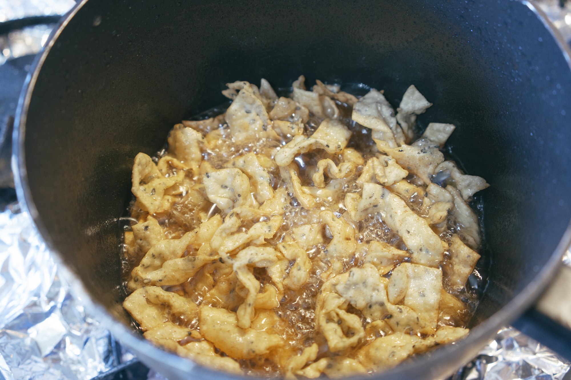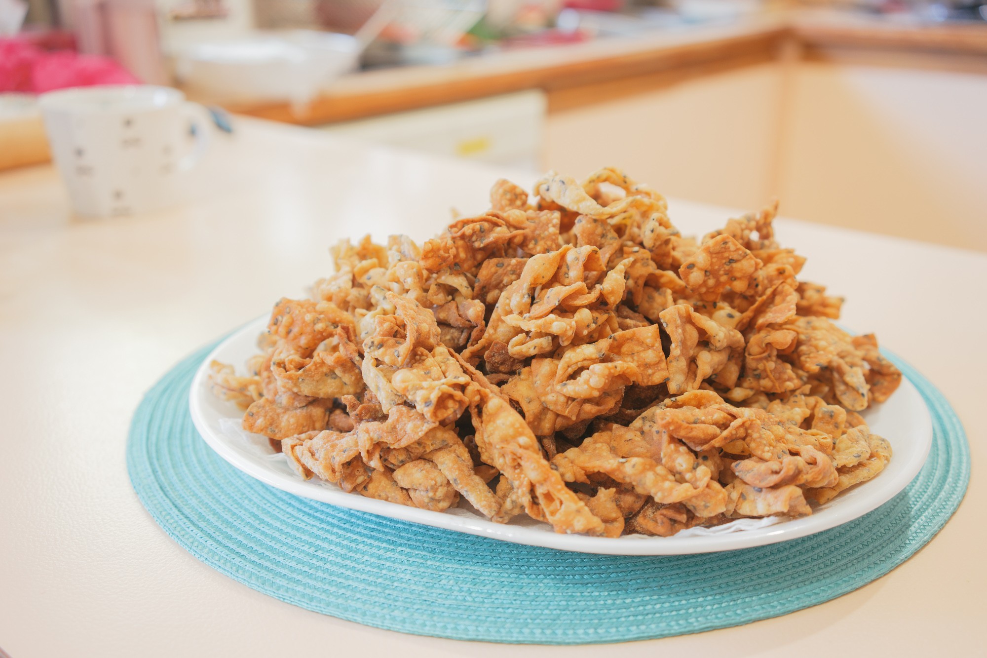 我的孩童时代是在武汉度过的。记忆中过年意味着全家人聚在外婆家,烤火盆,放烟花,吃零食,打牌,一直熬到春晚放“难忘今宵”。过年有几样特定要吃的东西,放在簸箕里面炸好的肉丸子,藕丸子;放在阳台上冻的硬梆梆的糍粑;小煤炉上煨着的藕汤;白瓷碗里新鲜炸出来的的猪油渣;放在铁罐里面的麻花,翻角,瓜子花生等。那个时候虽然物质比现在差远了,吃的也不是什么特别新鲜健康的食物,呼吸的空气也混合着烟味和鞭炮的火药味,但对于我来说,那就是年的味道。自从我外婆去世以后,我母亲也甚少回武汉,更不用说买票困难的春节期间了。用她的话来说,爸妈没了,家就没了也就没有必要再回去了(我深以为然……)。因此我也有好些年没有吃到过翻角这种年味十足的零食了。某一天看到香港超市卖的节日零食价格感人,我决定自己动手做翻角过年。(BTW,他们之前卖广氏菠萝啤一罐是$1.4左右,可能因为太好卖了,现在直接变$2.4。怎么不去抢?🤬)